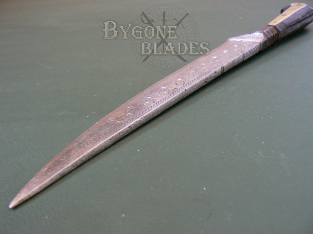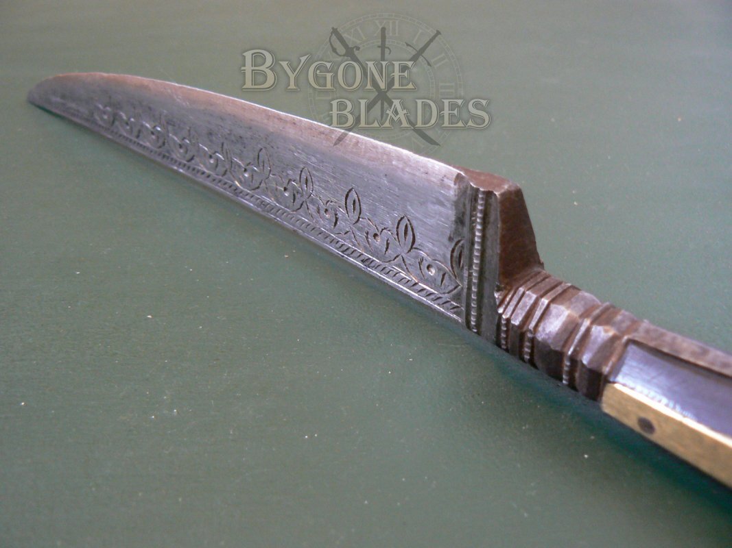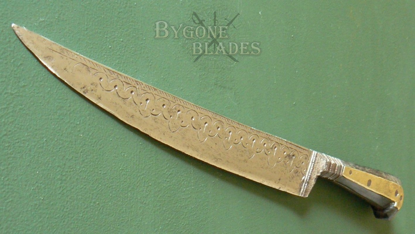 This is an interesting 19th Century Indo-Persian Pesh Kabz / Kard knife with hilt scales of buffalo horn inset with yellow metal.