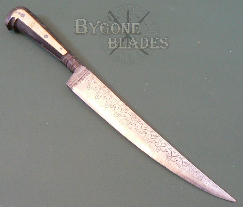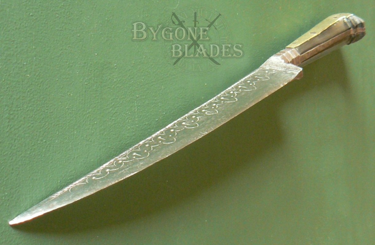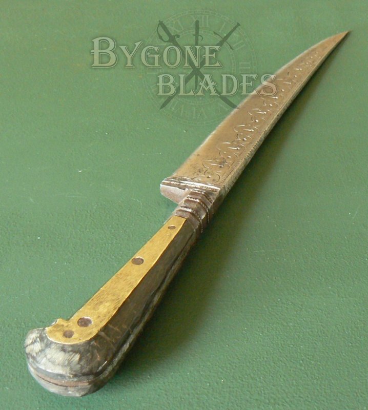 The 230mm blade is of layered steel and differs from the customary “T” shaped blades often associated with these knives. The nicely decorated blade is thick and heavy with an 8mm flat spine tapering to 1.5mm at the point. The blade has a triangular cross section and the edge is very sharp. The weight of the blade is nicely balanced by the steel front bolster and wide tang which broadens into the rounded, beaked rear bolster. The knife measures 348mm total length.