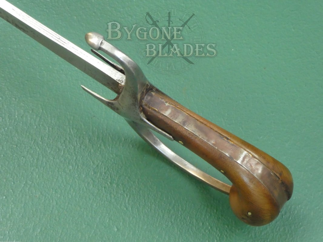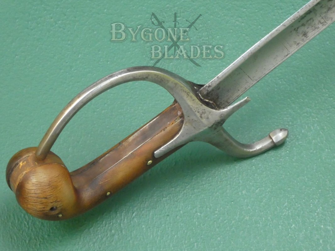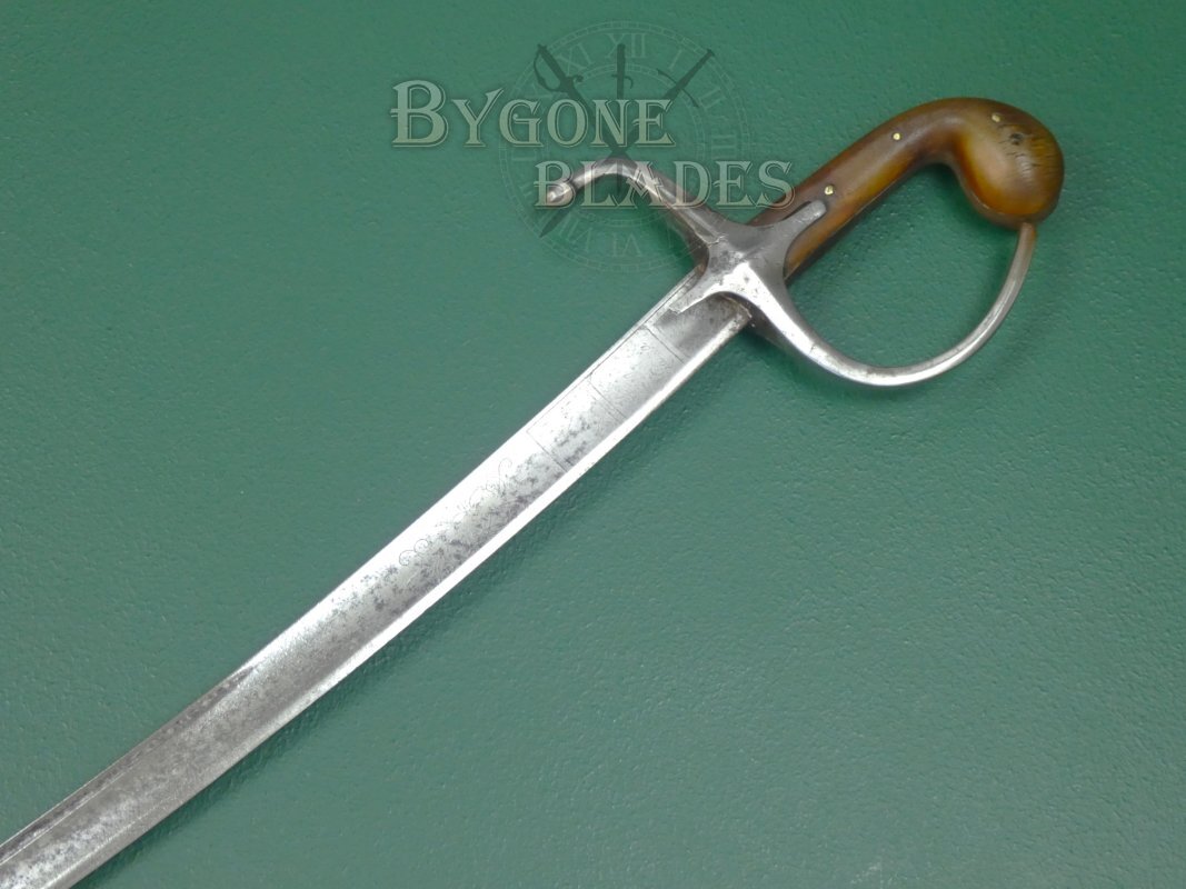 The horn hilt is of typical, bulbous pistol-grip form. The plain iron crosspiece has double languets and extends into a D-shaped knuckle bow and a down-turned bud-like quillon. The hilt is in good condition and the blade is firm, the horn grip scales being riveted through the tang.