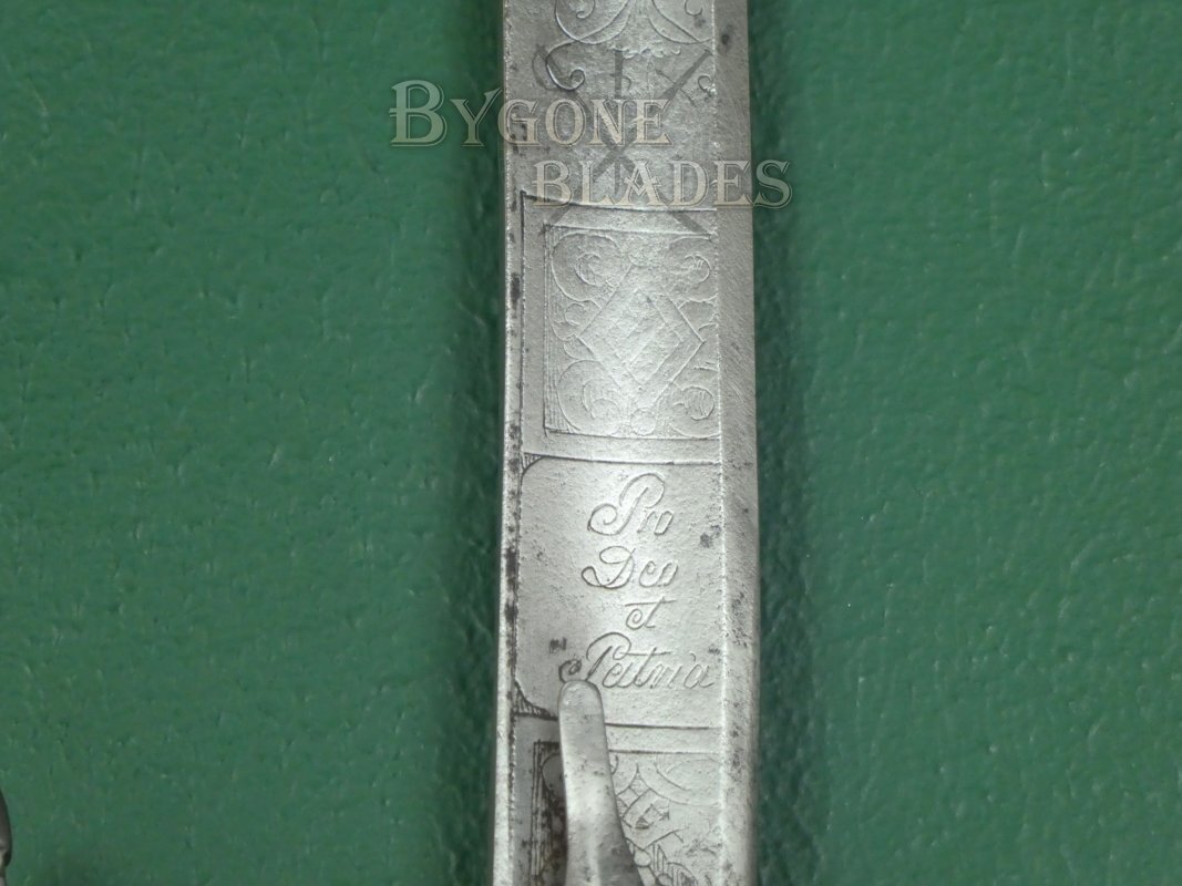 The 832mm slightly curved blade is of European origin and is of the French Montmorency style, having a deep, narrow fuller above a second, shallow and broad fuller. The blade is etched on both sides with European motifs and the dedication, “Pro Dio et Patria,” “For God and Country.” The Ottomans were tolerant of other faiths and Christians were incorporated into the Ottoman Empire and military. This could be a trade blade or a trophy blade.