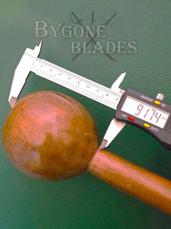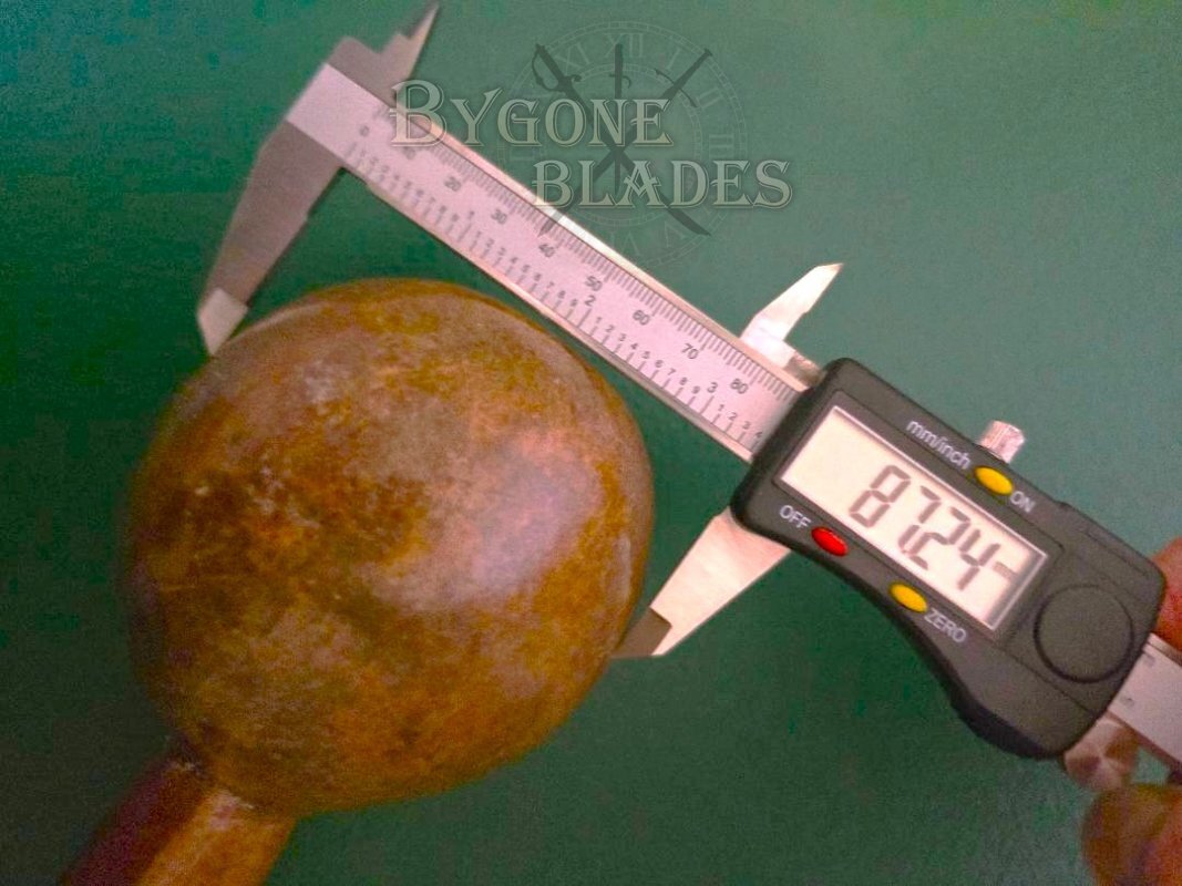 The haft of the club measures 26mm in diameter below the head, flaring to 31mm at the base. The haft is 422mm in length, giving a total length for the iwisa of 514mm.