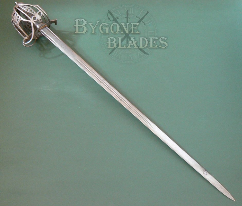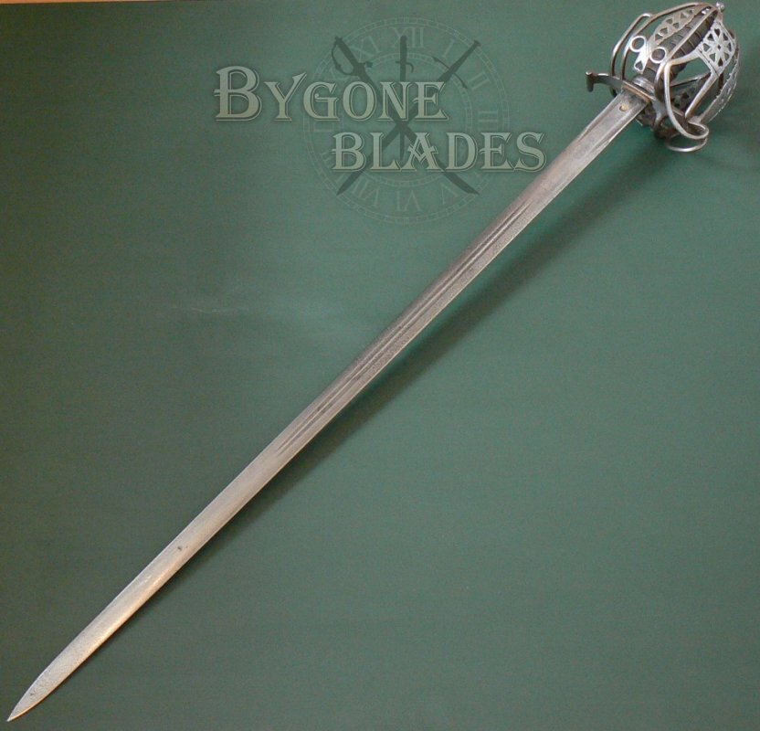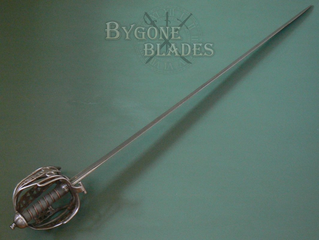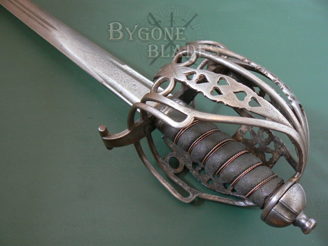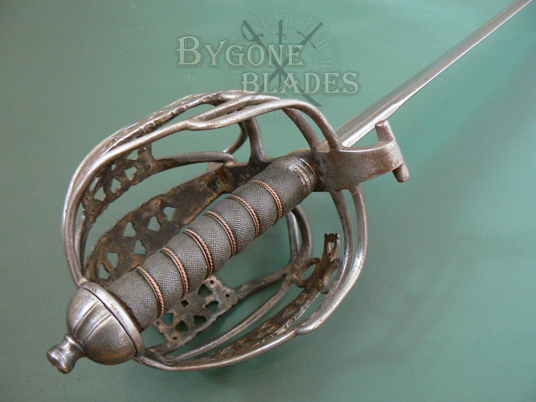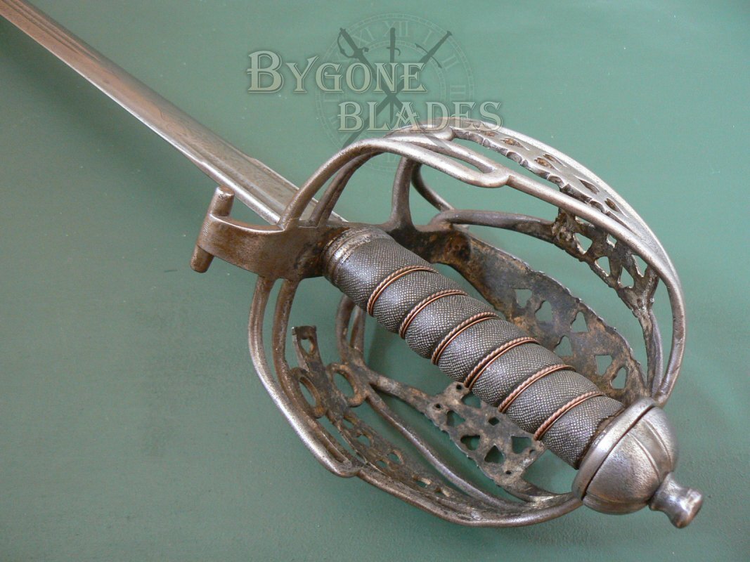 The heavy steel basket hilt is of traditional form and is in excellent condition with only minor tarnish. The ray skin grip is in good used condition and the twisted wire binding is tight.