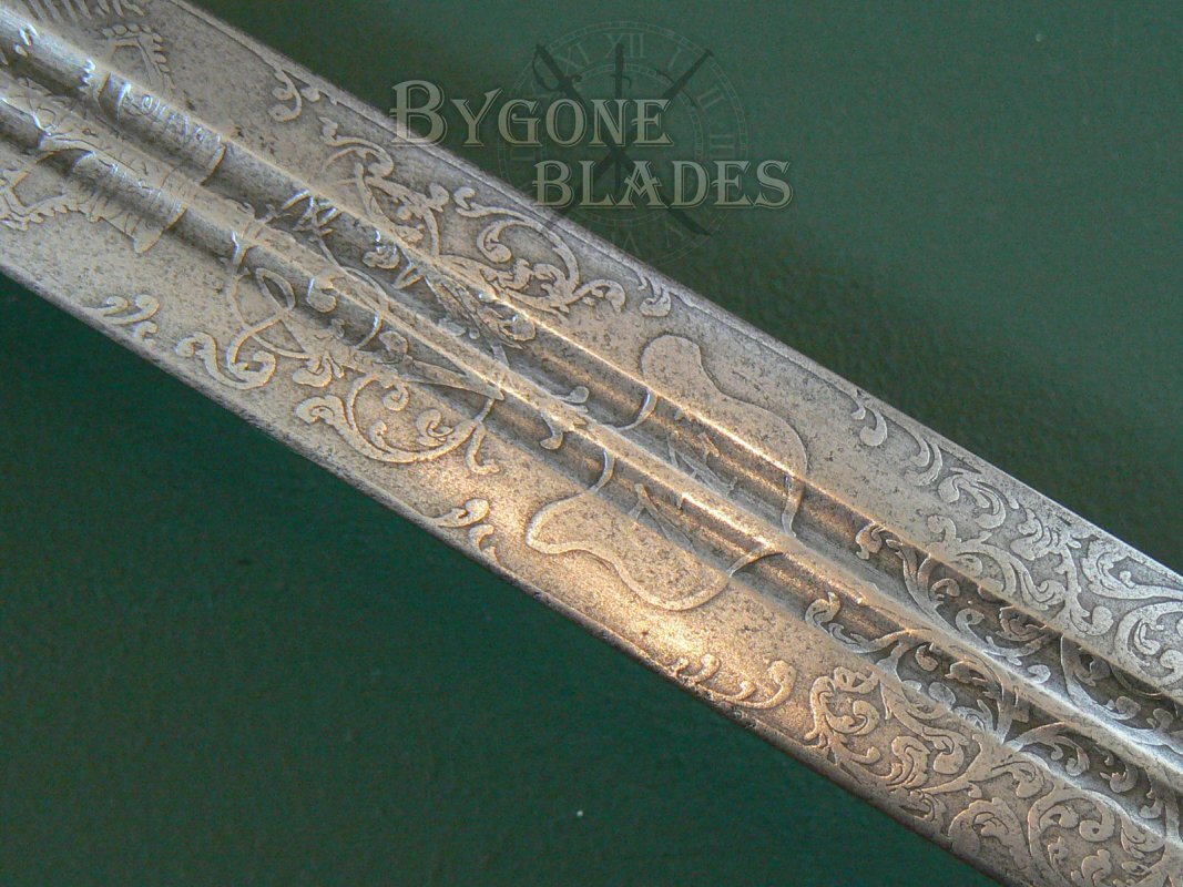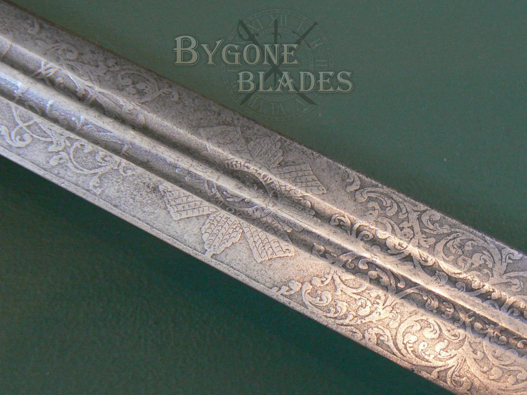 The 830mm double-edged blade is of fighting weight and retains its service edge. The blade is of typical form, with two narrow fullers on each side, tapering to a spear point. The blade is in good condition with minimal age related tarnish and is etched with panels of foliate scrollwork, Queen Victoria’s Royal cypher and the badge and motto of the Order of the Thistle, (Nemo Me Impune Lacessit – No-one attacks me with impunity) as well as the badge of the 74th Highland Regiment. The obverse ricasso bears a brass proof slug.