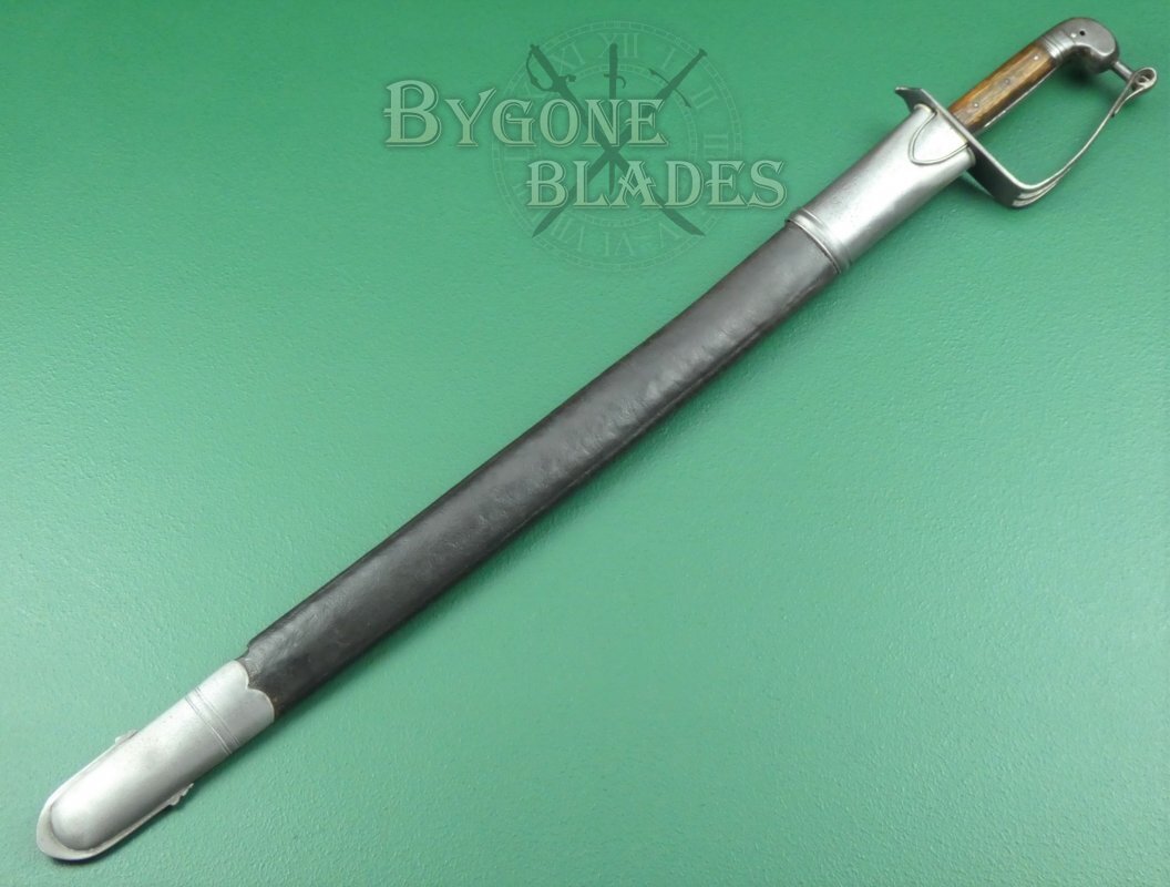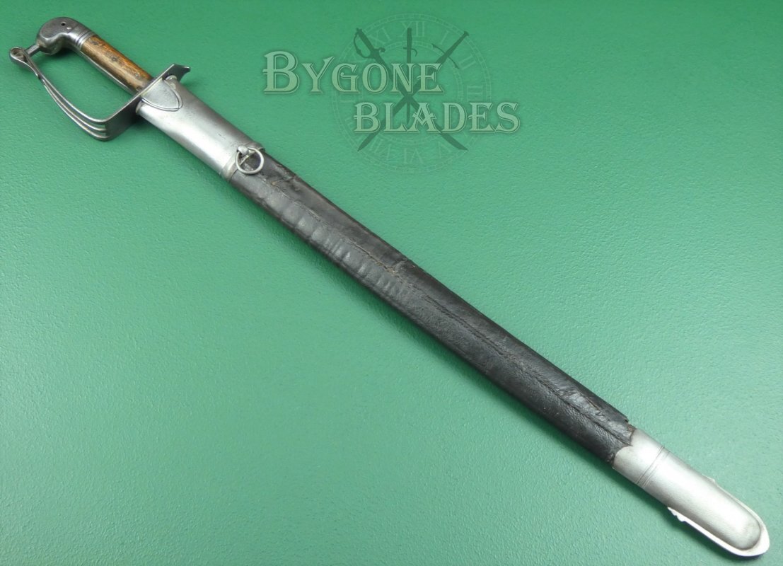 The sword is complete with its leather covered wooden scabbard. The scabbard has a steel locket and chape, the locket having a central suspension ring. The scabbard is in good condition with age and use related scuffs, tears and wear to the leather and a small loss to the back edge above the chape. The sword sheathes and draws smoothly and is held firmly within the scabbard.
