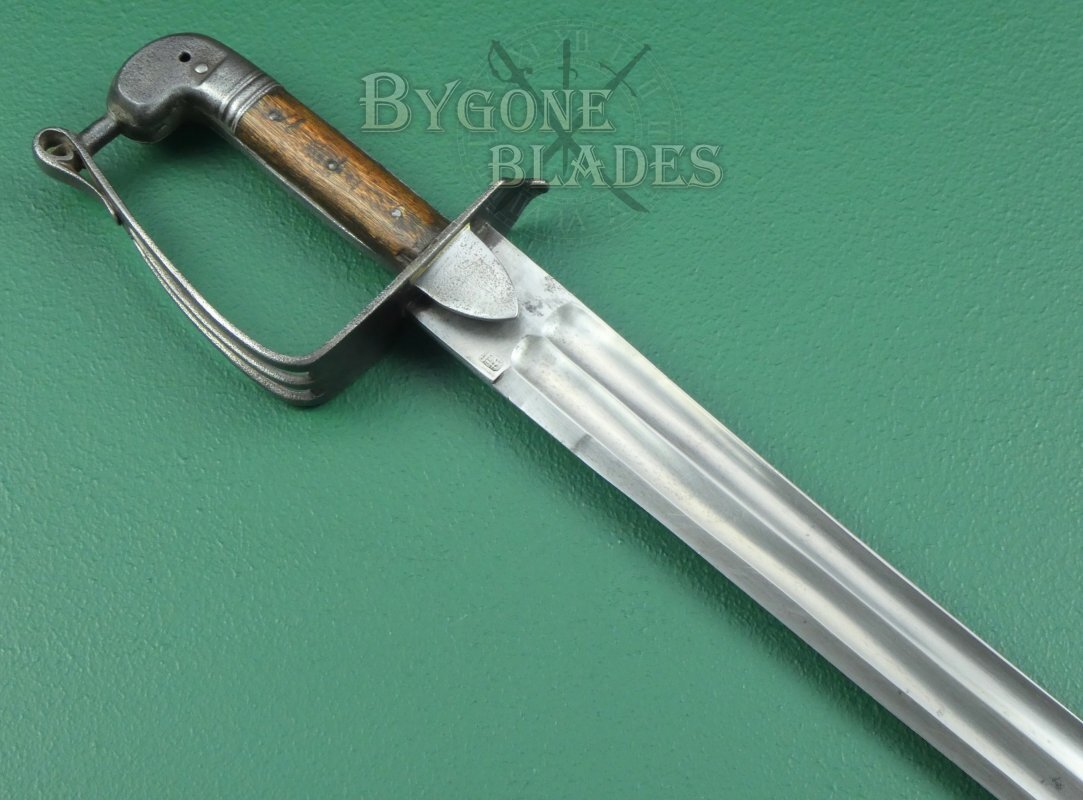 The iron hilt has three thin bars to the knuckle bow. The bars converge forwards to form a wide, flat crosspiece with shield langets and a short rear facing quillon. The knuckle bow narrows towards the pommel and terminates in a narrow, scrolled tail that is doubled over and attached to the mameluke-style iron pommel by means of a riveted cylindrical rod. The hilt is gripped with hardwood scales that are riveted firmly in place through the tang. The blade is firm in the hilt.