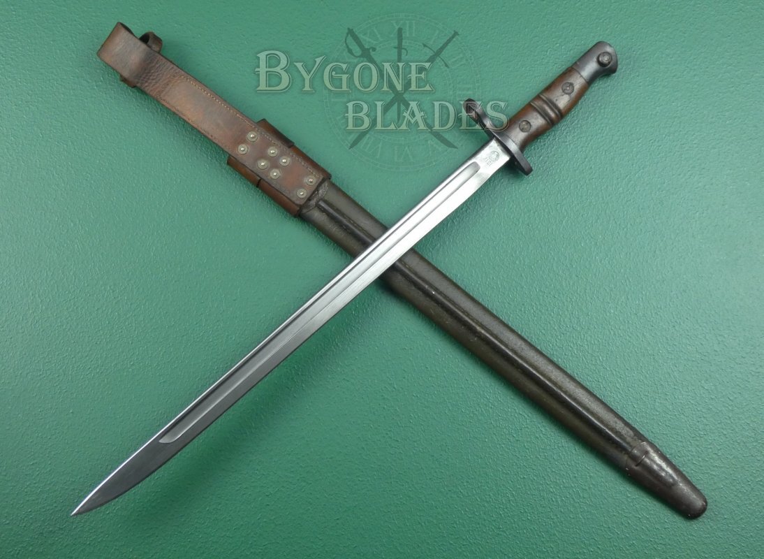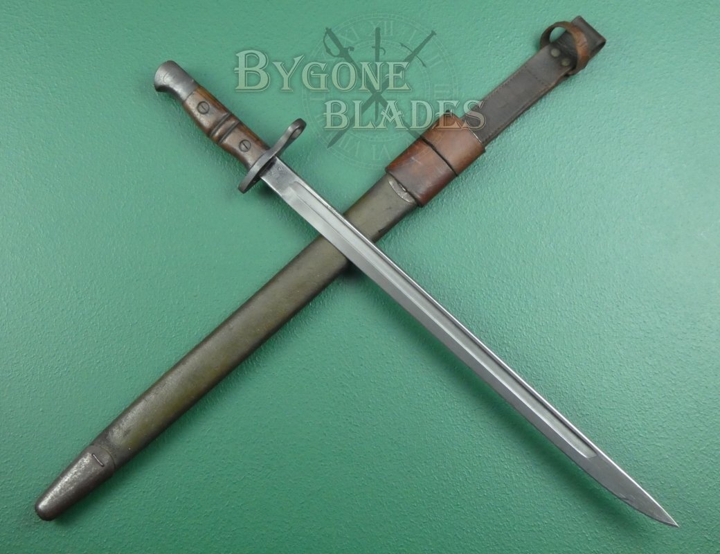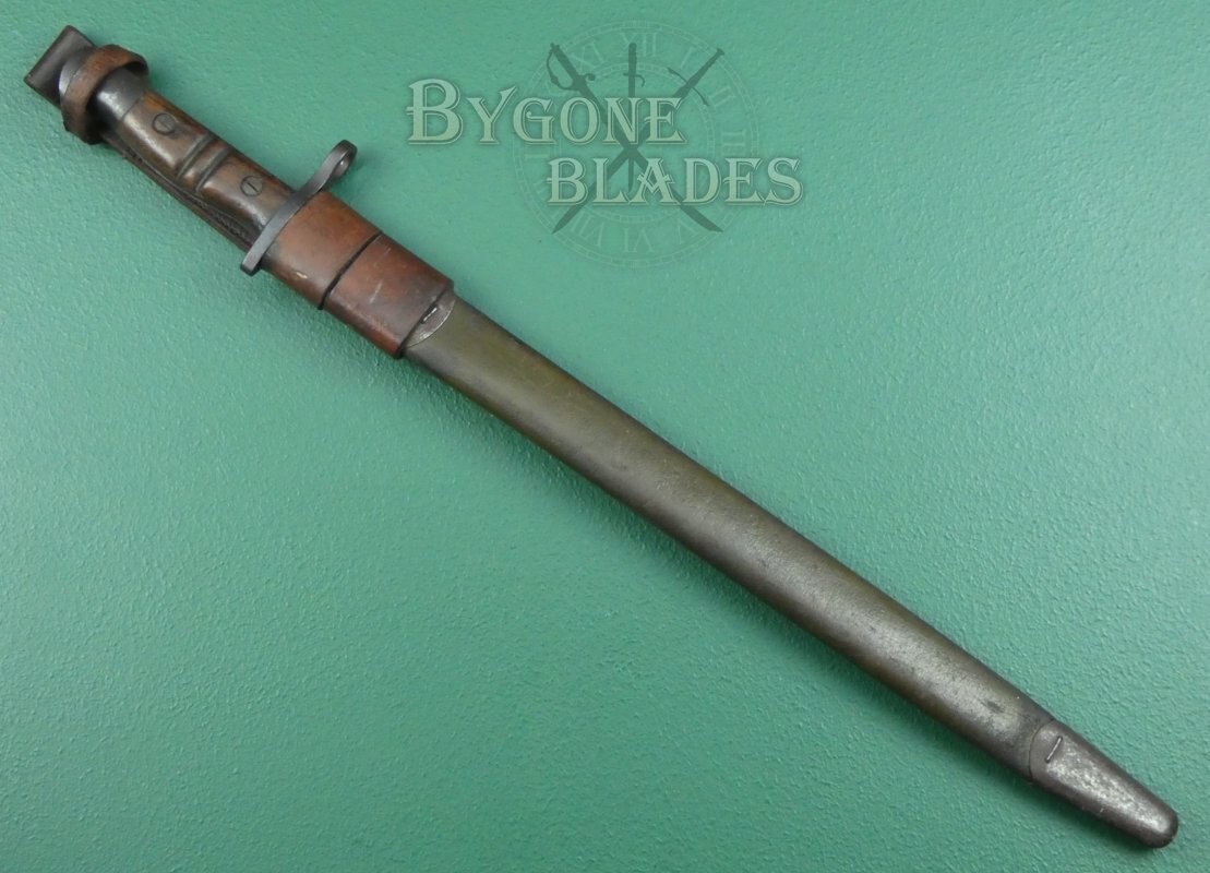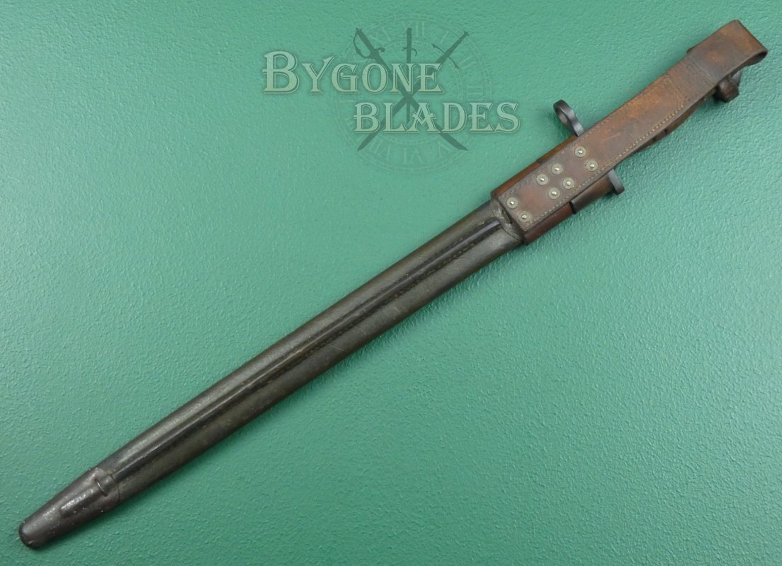 The bayonet is complete with its American M1917 Mk III green leather scabbard with a British leather frog commonly associated with the Home Guard. The scabbard and frog are in good condition. The leather is firm and undamaged with age and use related wear. The stitching is intact and strong. The bayonet sheathes and draws smoothly and is held firmly within the scabbard.