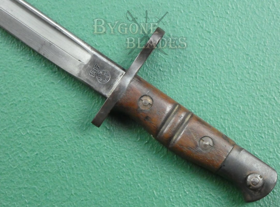This American WW1 1917 Pattern bayonet was imported to the UK for service in WW2 and was issued to Home Guard and auxiliary units. The bayonet was made by Remington.
