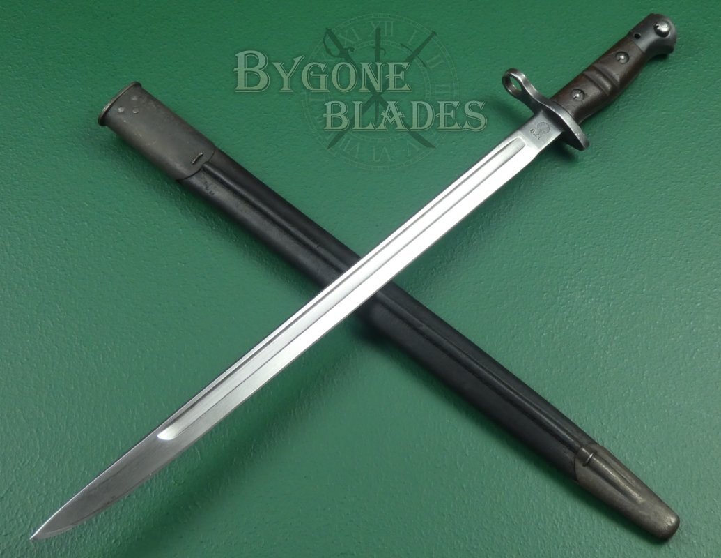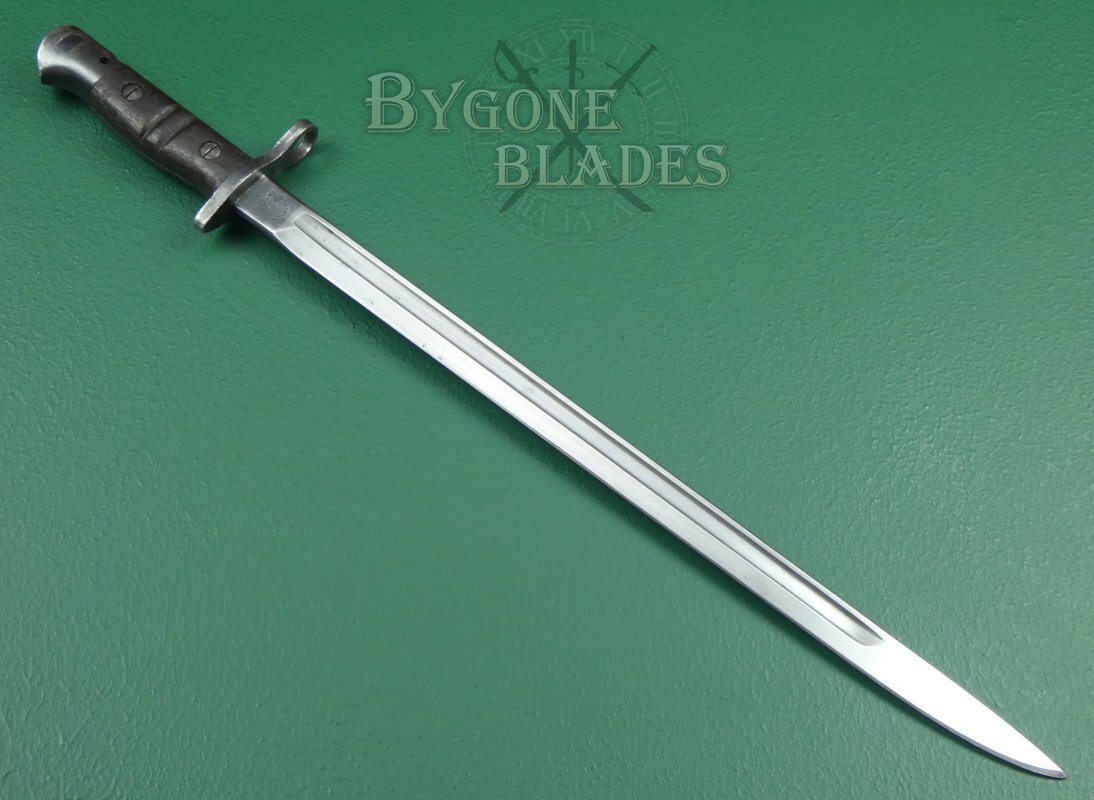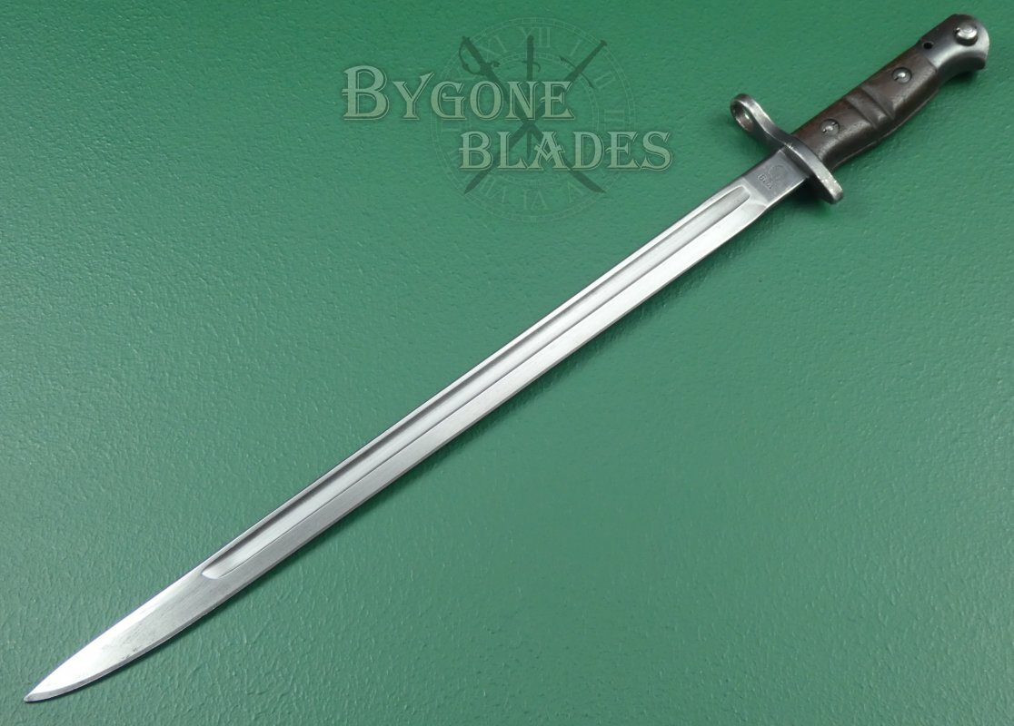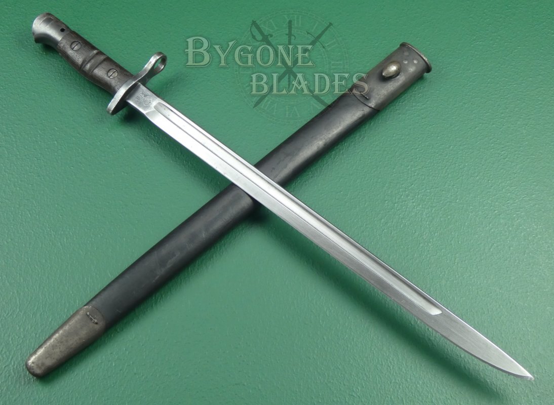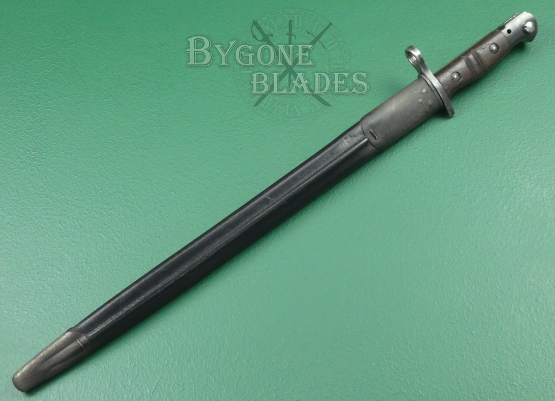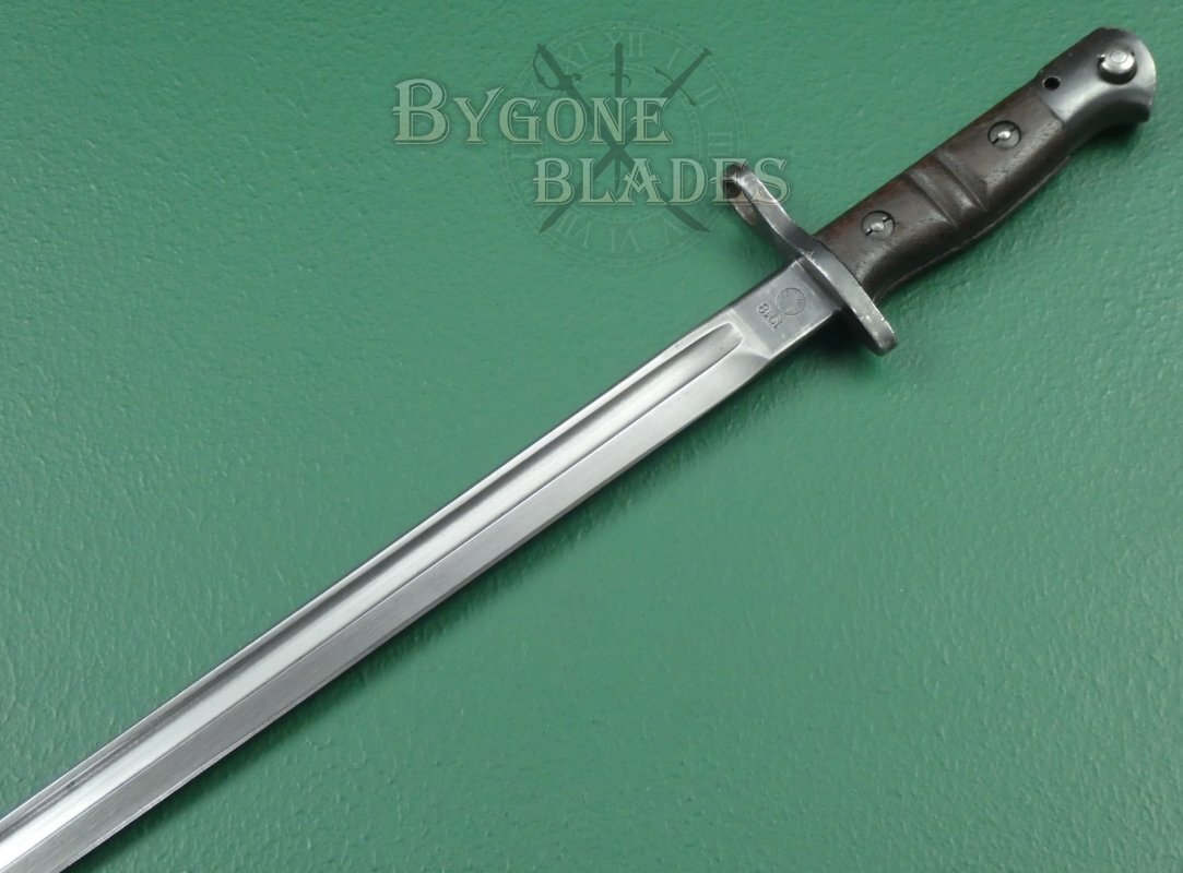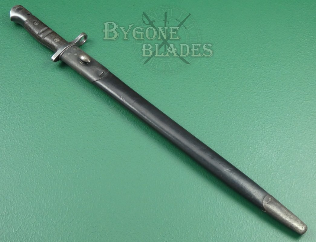 The bayonet is complete with a black leather scabbard with teardrop frog stud. The scabbard is in very good condition. The locket and chape retain their original blueing. The leather is firm and undamaged with the stitching intact and strong. The bayonet sheathes and draws smoothly and is held firmly within the scabbard.
