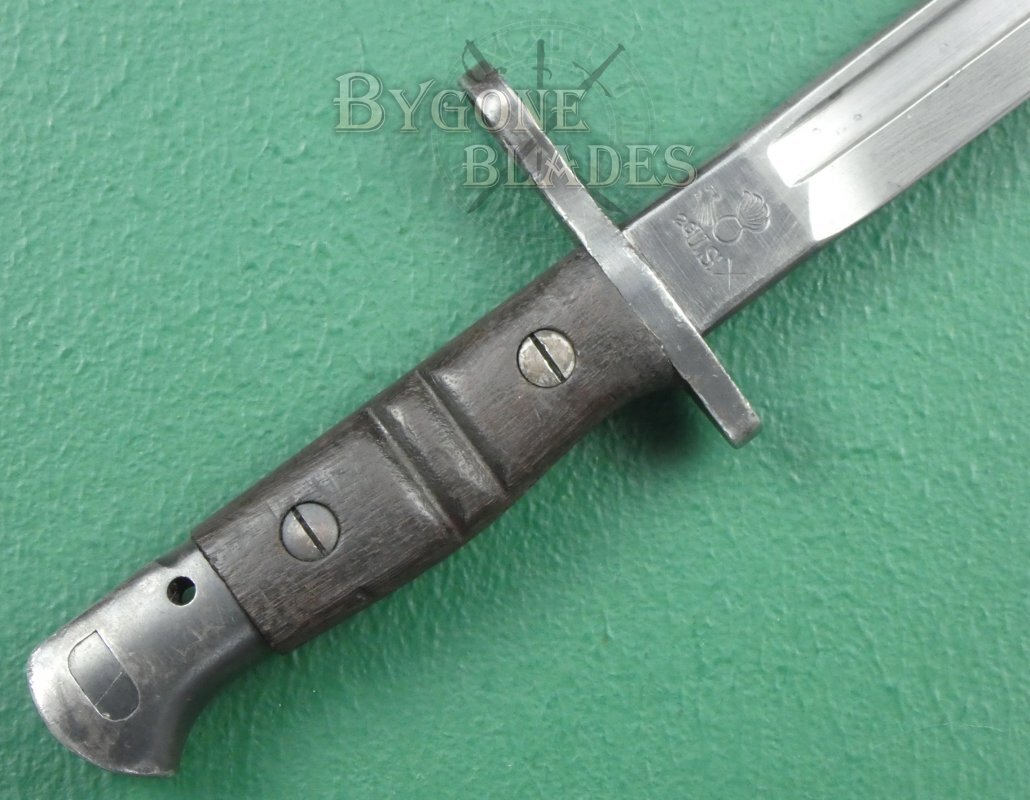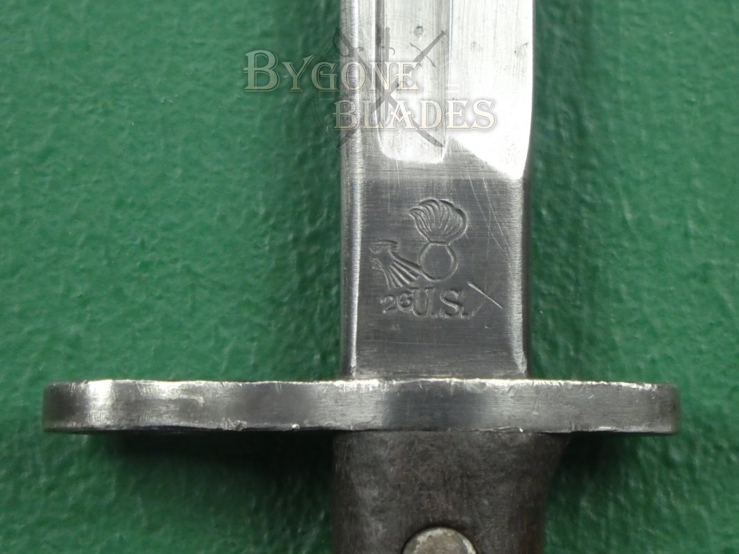 The blued ricasso is incorrectly stamped with the year, 1918 instead of the 1917 pattern designation above the Remington maker’s mark. The obverse ricasso bears the “flaming grenade” over “US” ordnance stamp and the eagle head, numbered inspection stamp. The cross guard and pommel retain most of their original blueing and the wooden hilt scales are in excellent condition. The press-stud locking mechanism works perfectly.