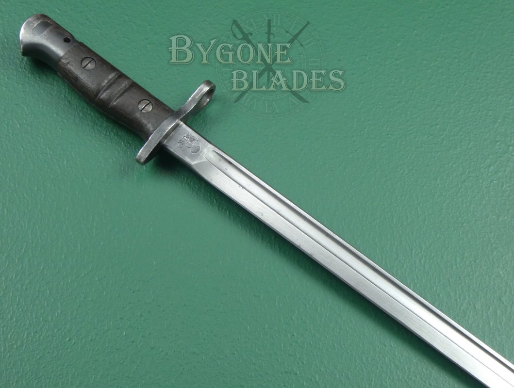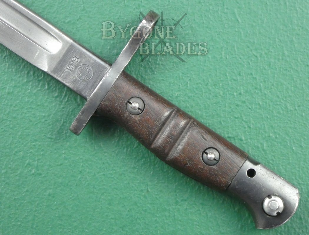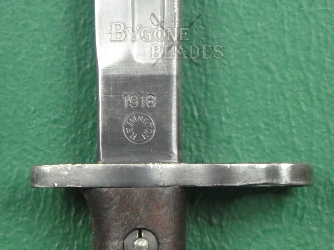 This American WW1 1917 Pattern bayonet for the Enfield .30 calibre rifle was made by Remington in 1918. At the beginning of the year, Remington mistakenly used the manufacture date, 1918 in place of the pattern designation. The bayonet should be stamped with the designation 1917. This error was soon rectified and 1918 stamped Remington P17 bayonets are scarce.