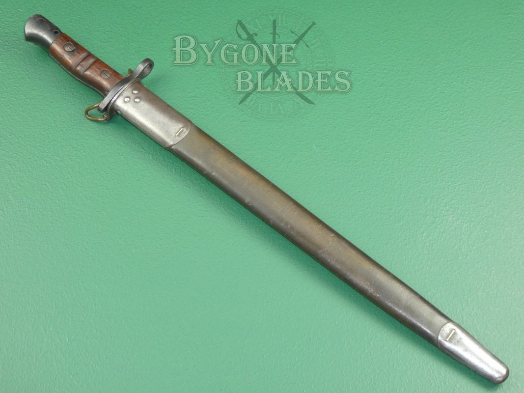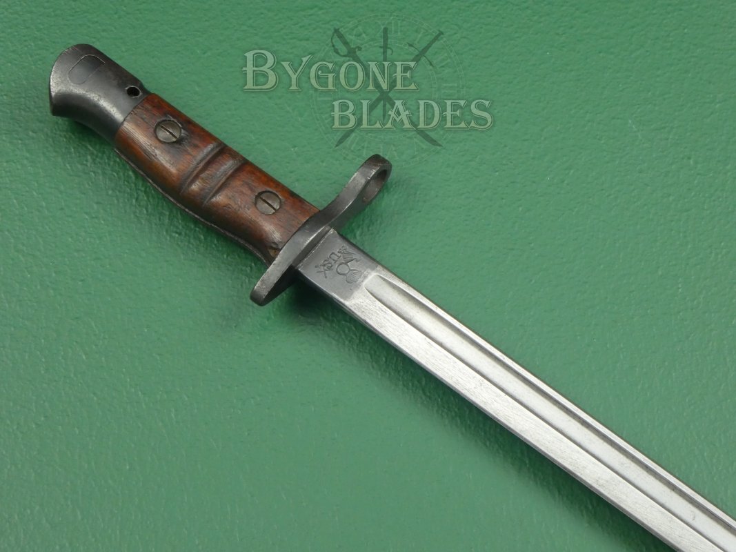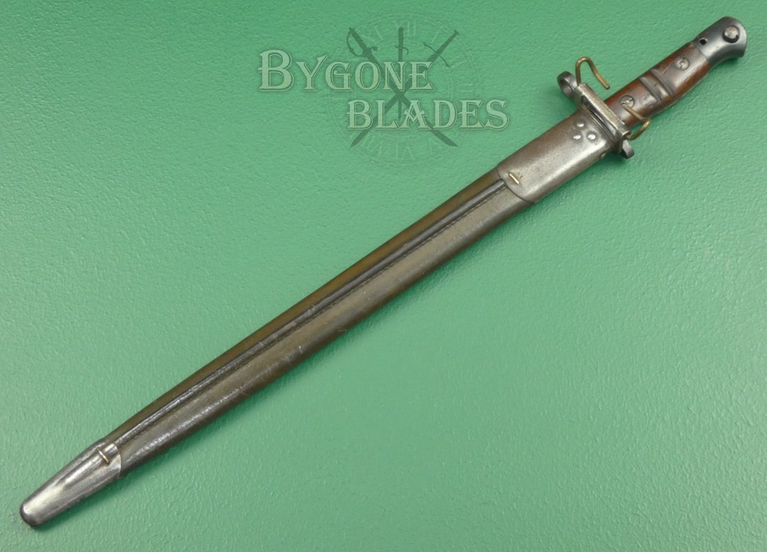 The bayonet is complete with its original Jewell Mk II green leather scabbard, which is in very good condition. The leather is firm and undamaged and the stitching is intact and strong. The bayonet sheathes and draws smoothly and is held firmly within the scabbard.