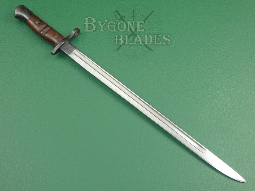 The 431mm blade has a deep single fuller on both sides and a rounded spine. The blade is in great condition and retains its original factory edge and blueing to the ricasso.