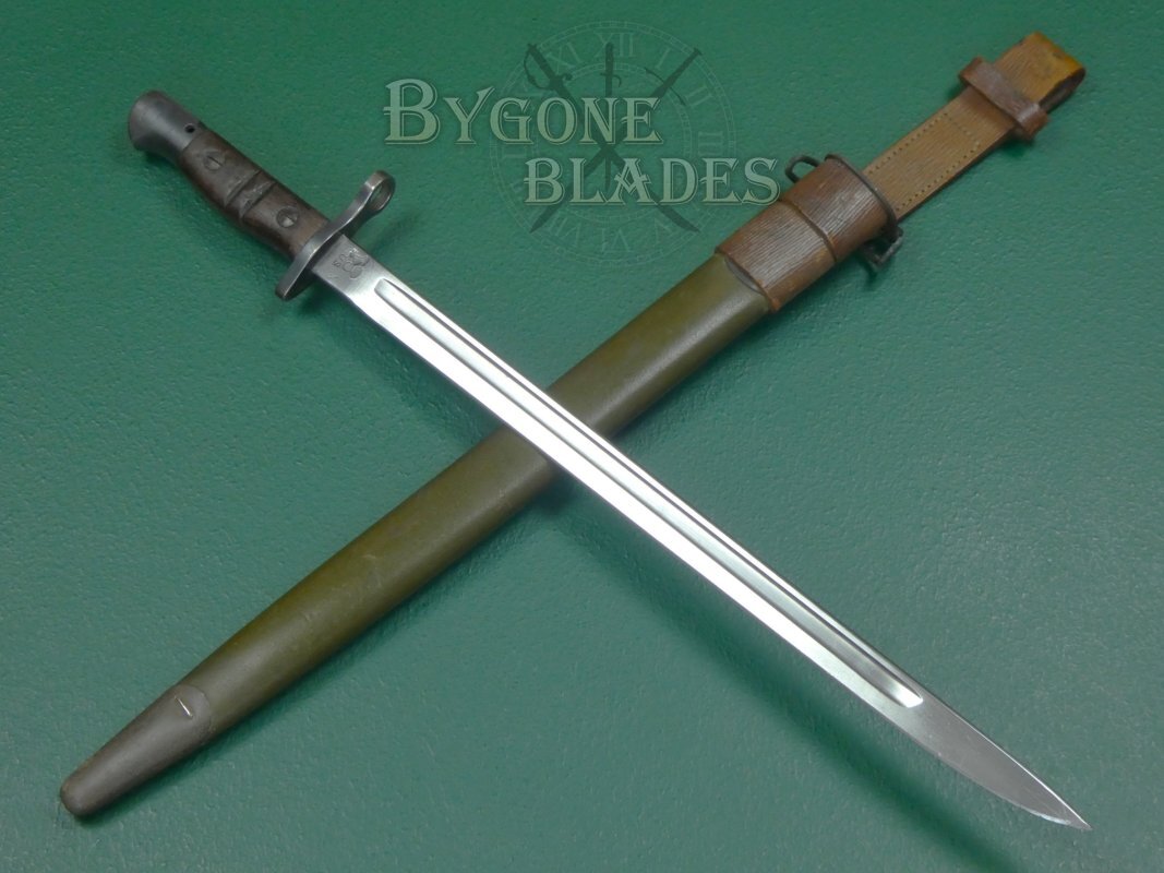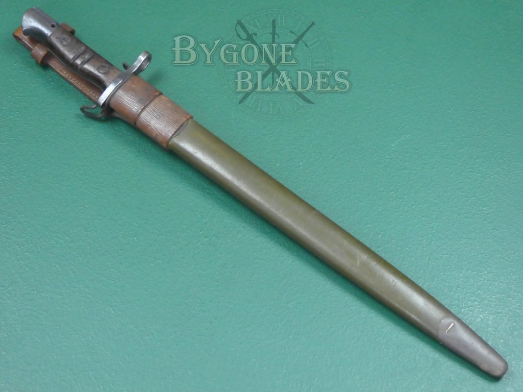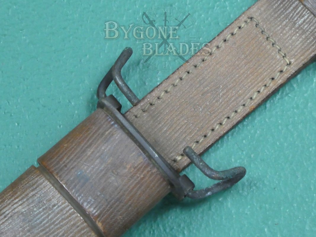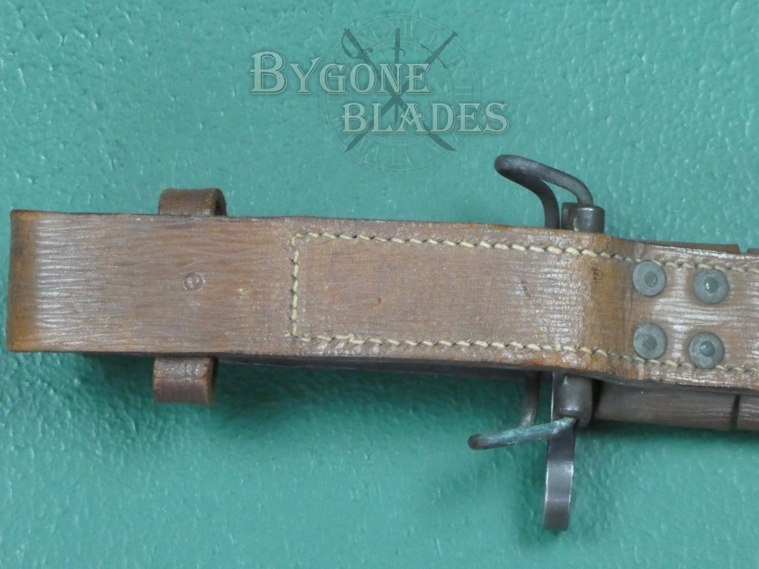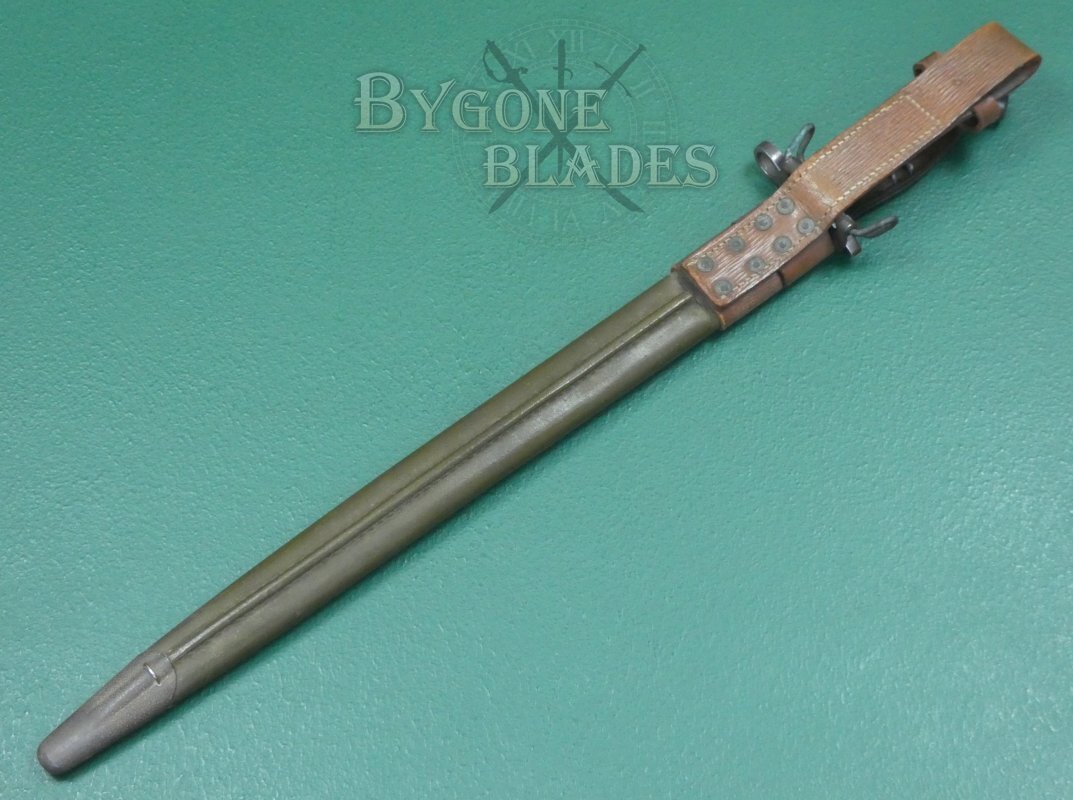 The bayonet is complete with its original Mk II green leather scabbard, which is in great condition. The leather is firm and undamaged. The stitching is intact and strong. The scabbard is complete with a 1939 pattern brown leather frog with Broad Arrow stamp, indicating the bayonet was reissued, probably for Home Guard service during WW2. The bayonet sheathes and draws smoothly and is held firmly within the scabbard.