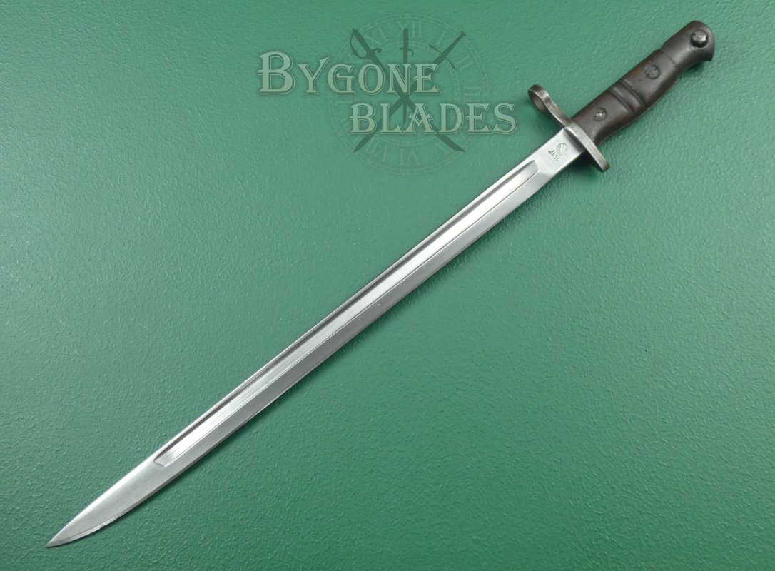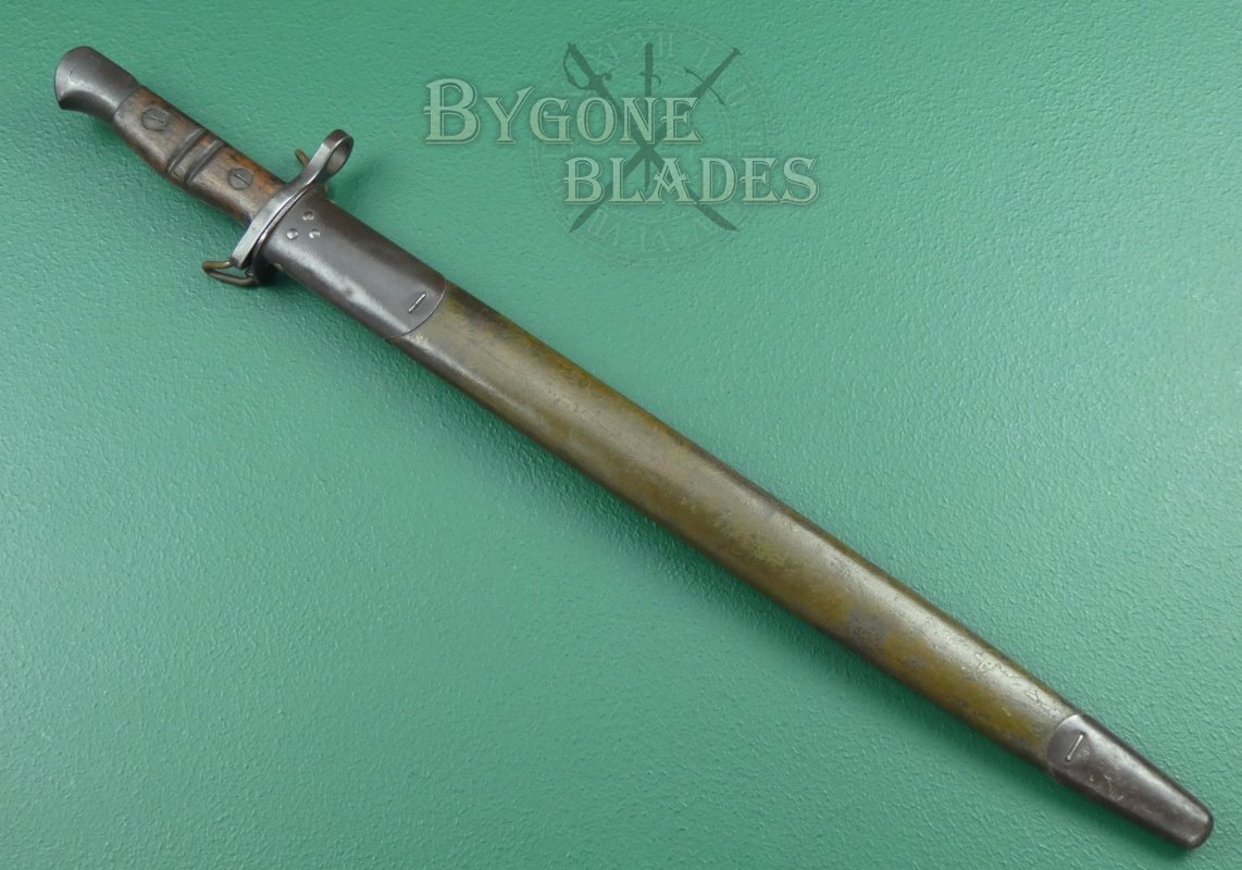 The bayonet is complete with its original green leather scabbard, which is in very good condition with staining and marks from age and use. The locket and chape retain their original blueing. The green leather is firm and undamaged with the stitching is intact and strong. The bayonet sheathes and draws smoothly and is held firmly within the scabbard.