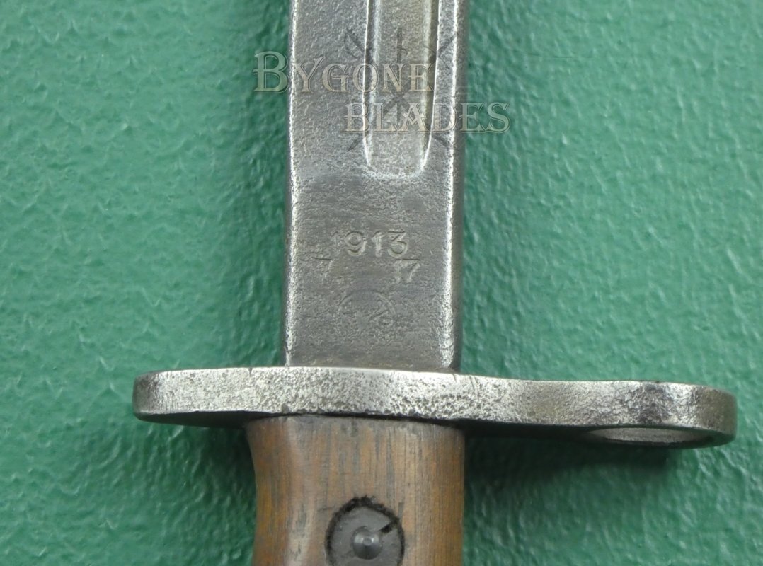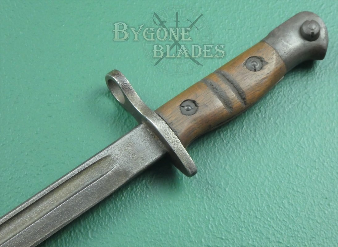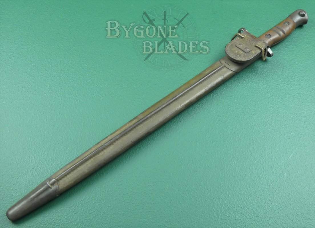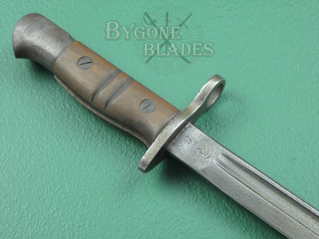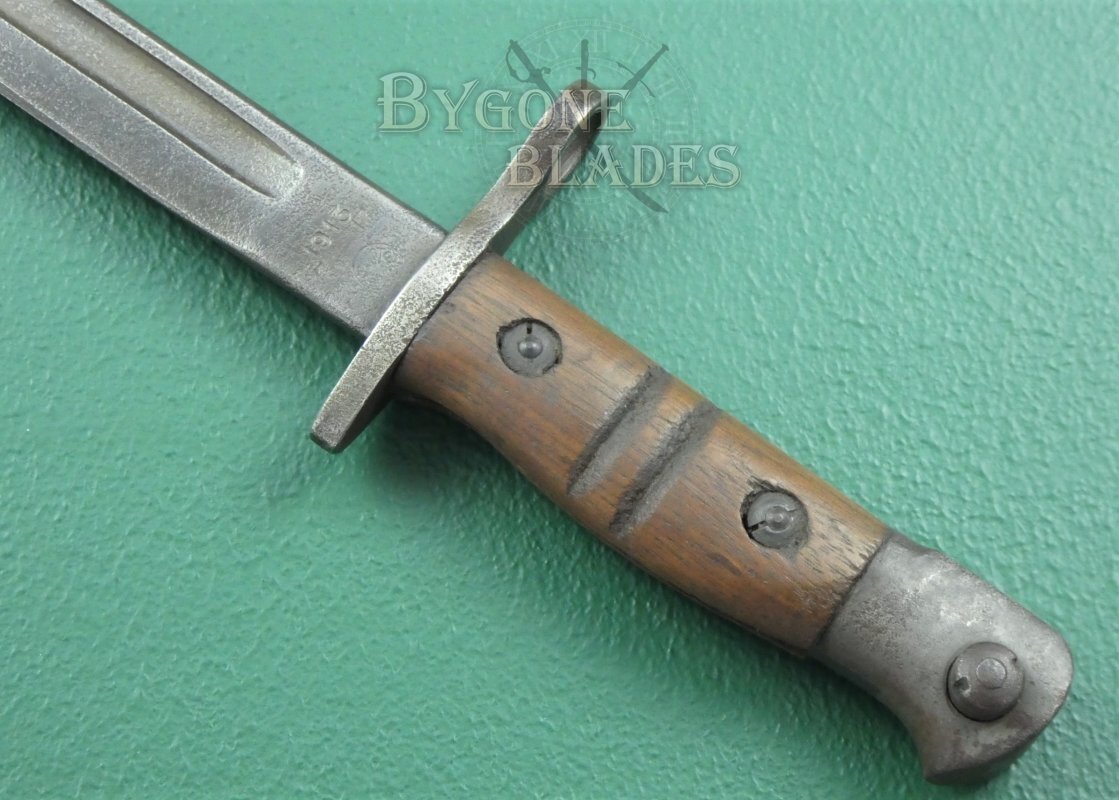 The P1913 bayonet was officially introduced into British service on the 21st June 1916 and was made under contract in the USA by Remington and Winchester. By the end of WW1, Remington had produced 1,243,000 of the P1913 bayonets.