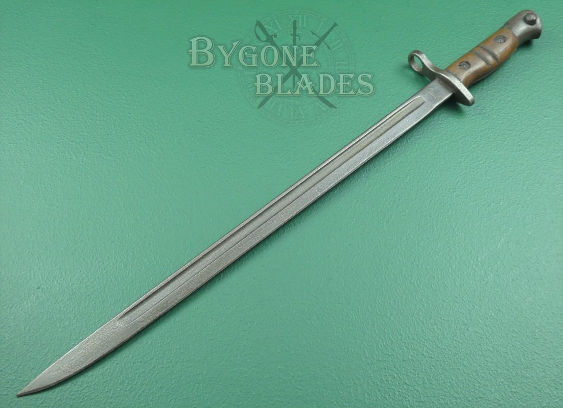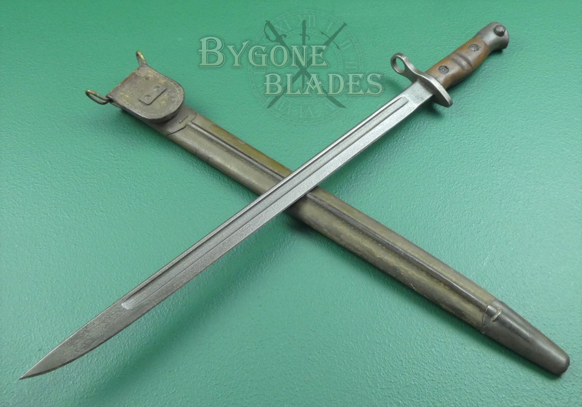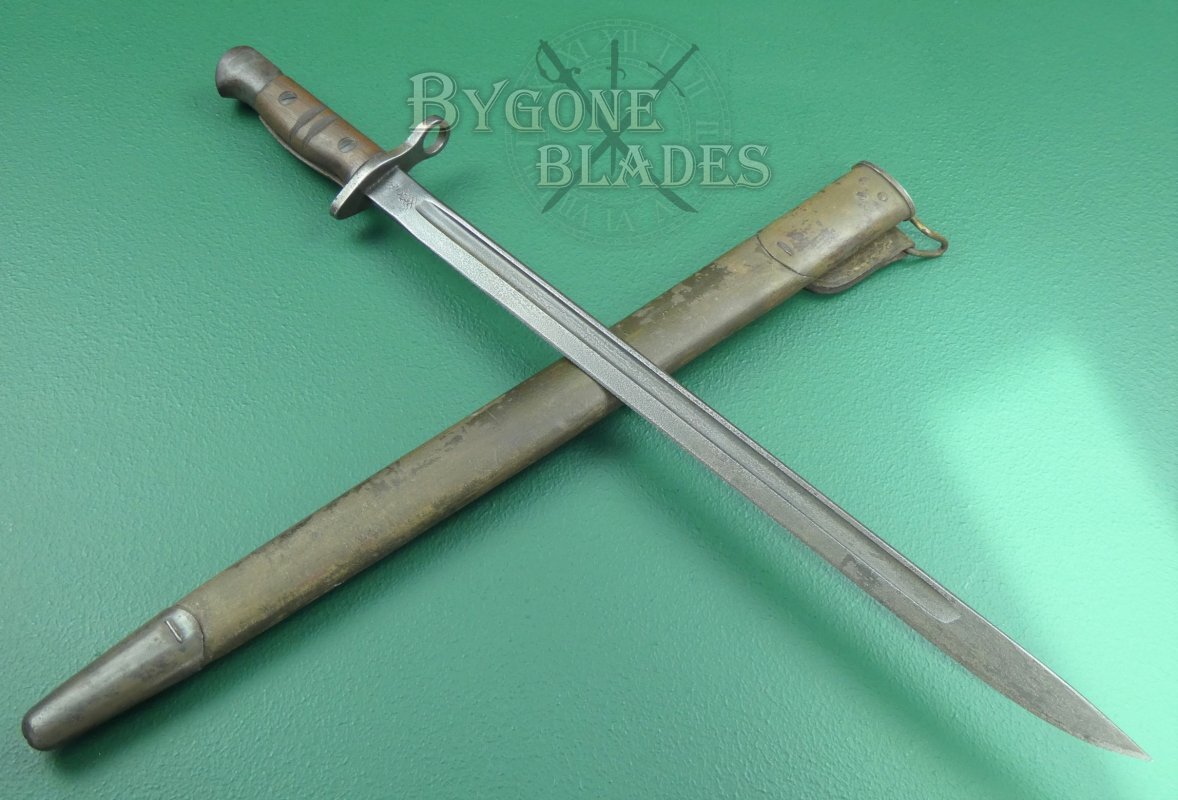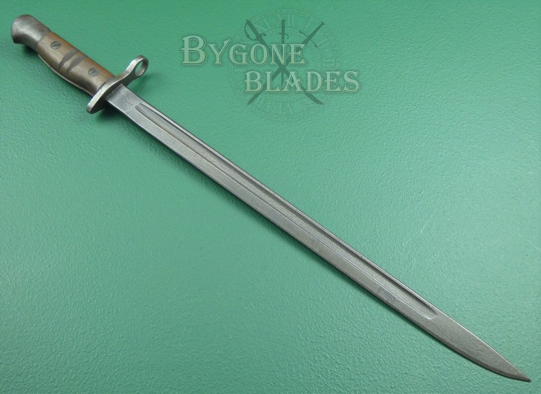 The P1913 bayonet was officially introduced into British service on the 21st June 1916 and was made under contract in the USA by Remington and Winchester. By the end of WW1, Remington had produced 1,243,000 of the P1913 bayonets.
