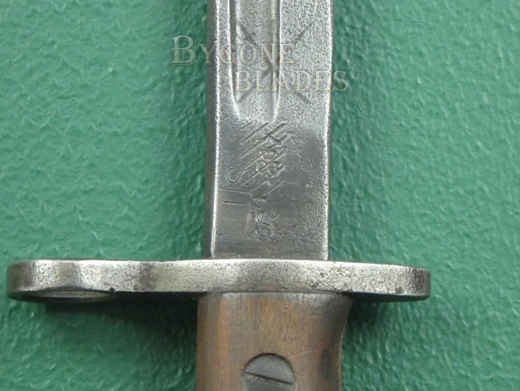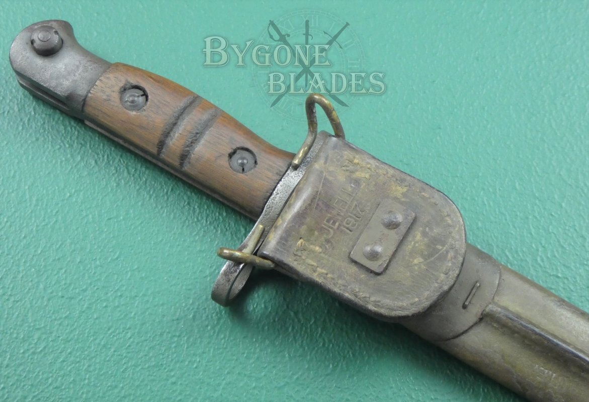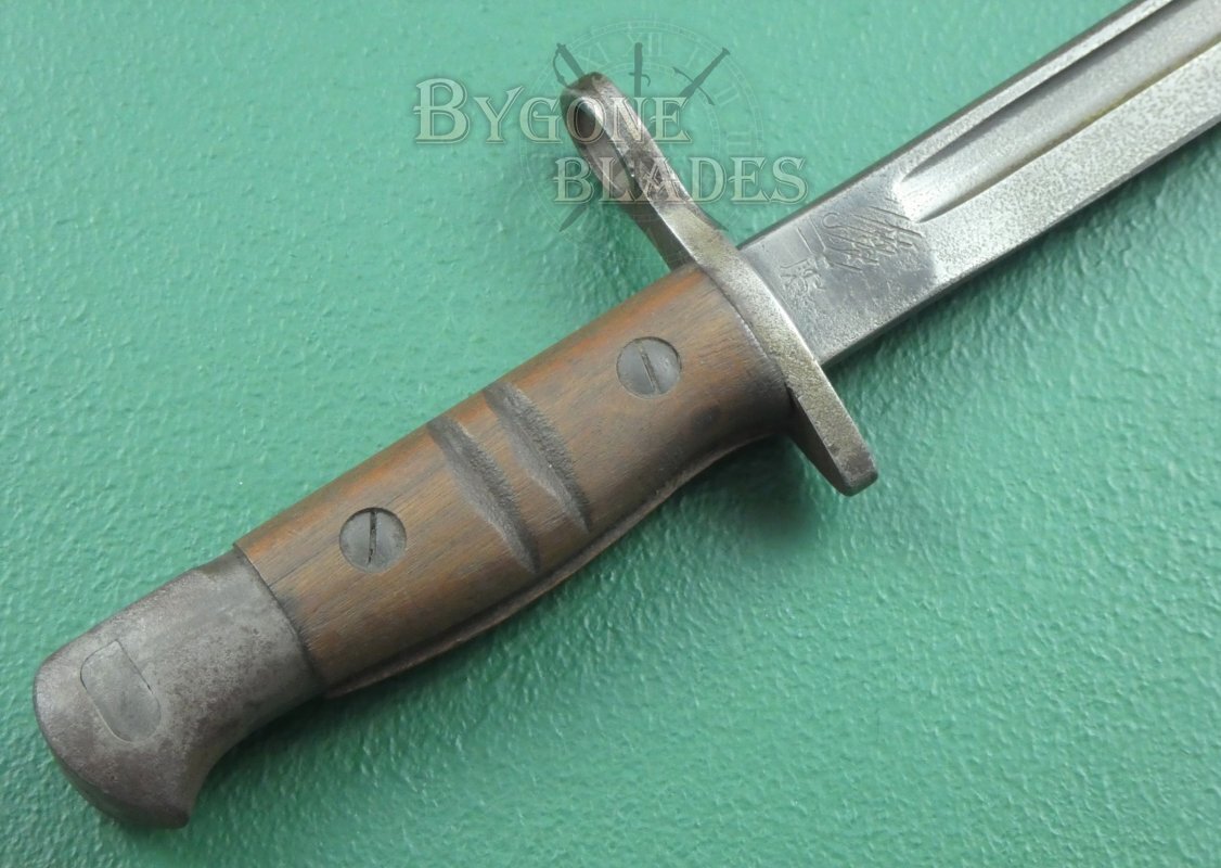 When the Americans began production of their P1917 bayonet, stocks of the British P1913 (which is essentially the same bayonet) were diverted for use in the American war effort. The British markings on the blades of the P13 were cancelled and replaced with American markings. The bayonets were then issued to US troops with the newly designed Jewell 1917 patter scabbard. This example has the scarce Jewell 1917 Mk 1 scabbard.