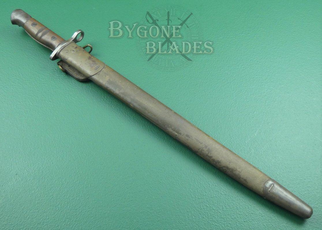The bayonet is complete with its original first pattern, Jewell 1917 dated green leather scabbard with integral belt hanger. The scabbard is in excellent condition and retains period applied green paint over the green leather. The locket and chape retain their original finish with minor wear. The leather is firm and undamaged and the stitching is intact and strong.