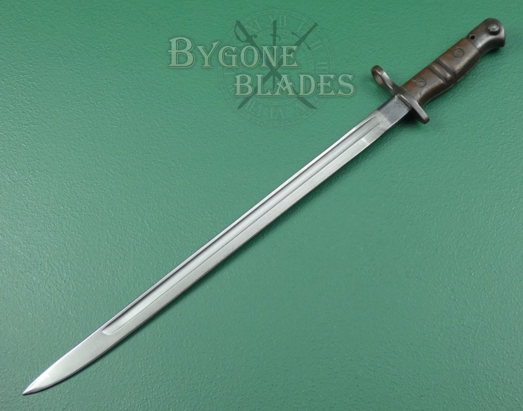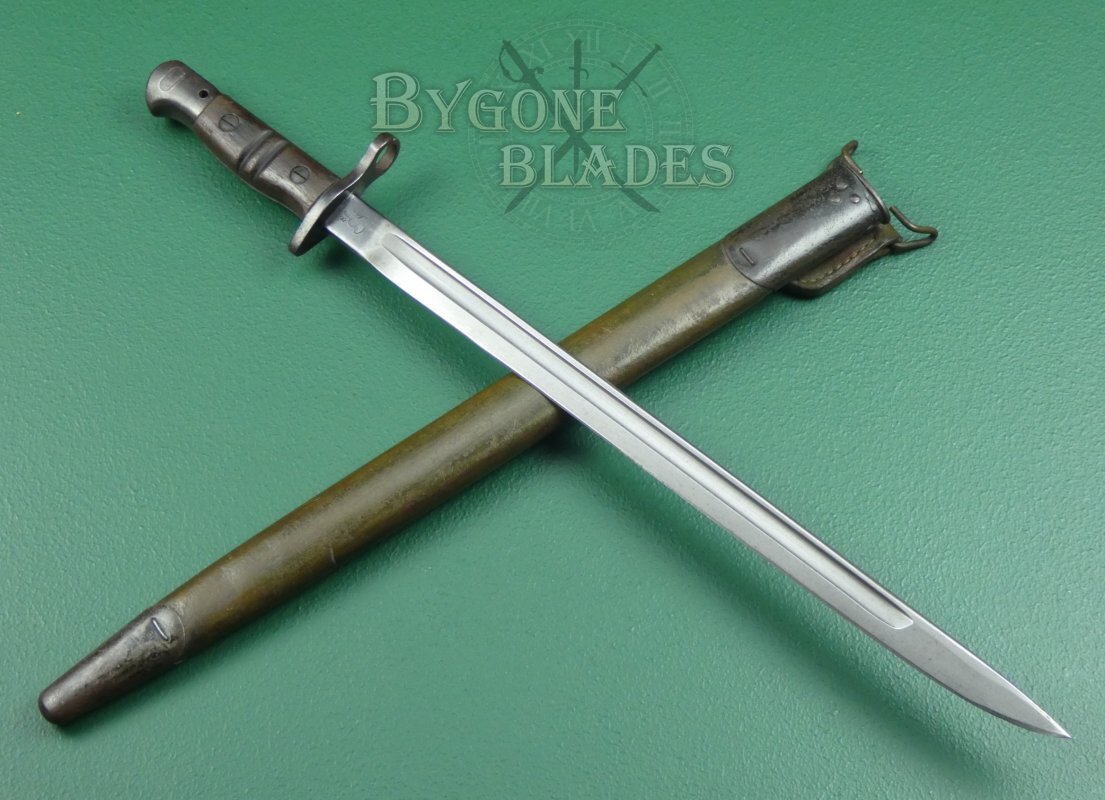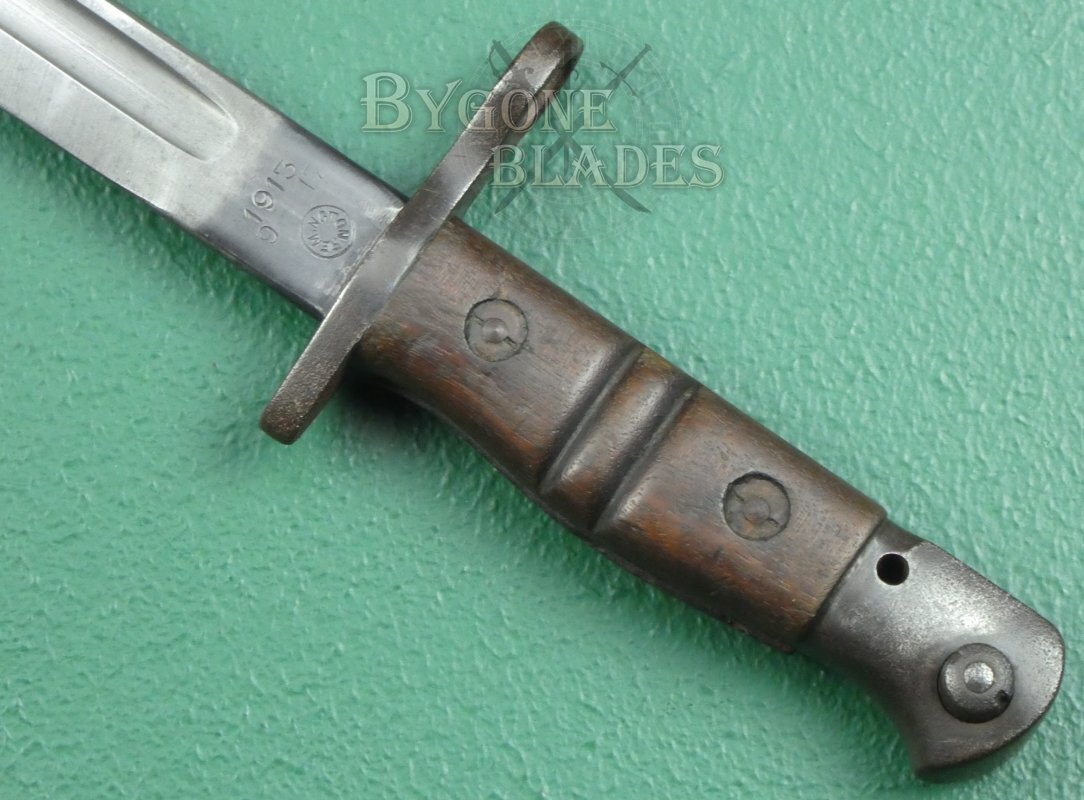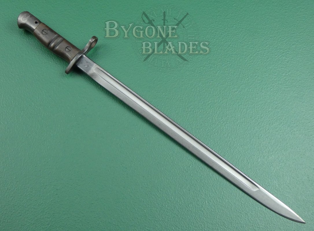 The P1913 bayonet was officially introduced into British service on the 21st June 1916 and was made under contract in the USA by Remington and Winchester. By the end of WW1, Remington had produced 1,243,000 of the P1913 bayonets.