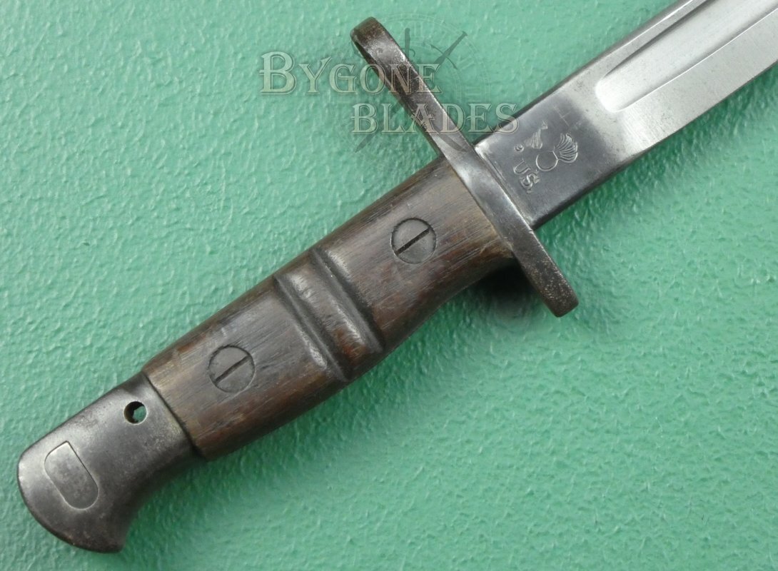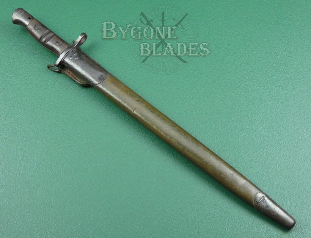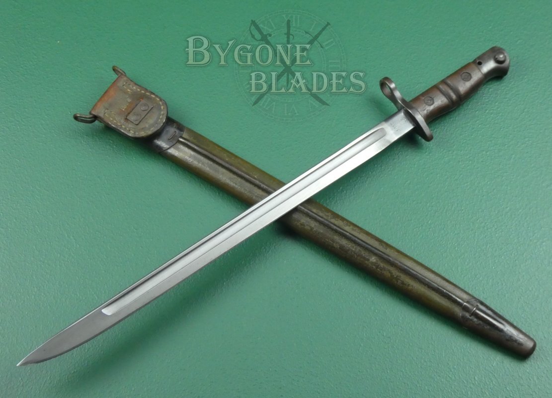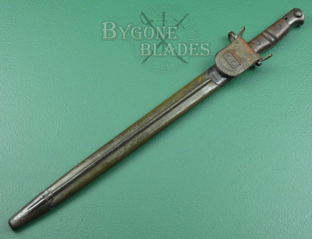 When the Americans began production of their P1917 bayonet, stocks of the British P1913 (which is essentially the same bayonet) were diverted for use in the American war effort. The bayonets were issued to US troops with the newly designed Jewell 1917 Mk1 pattern scabbard. This example has the scarce Jewell 1917 Mk 1 scabbard.