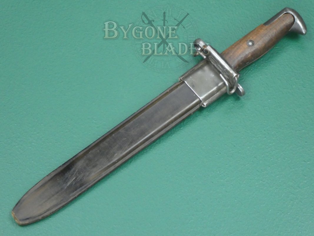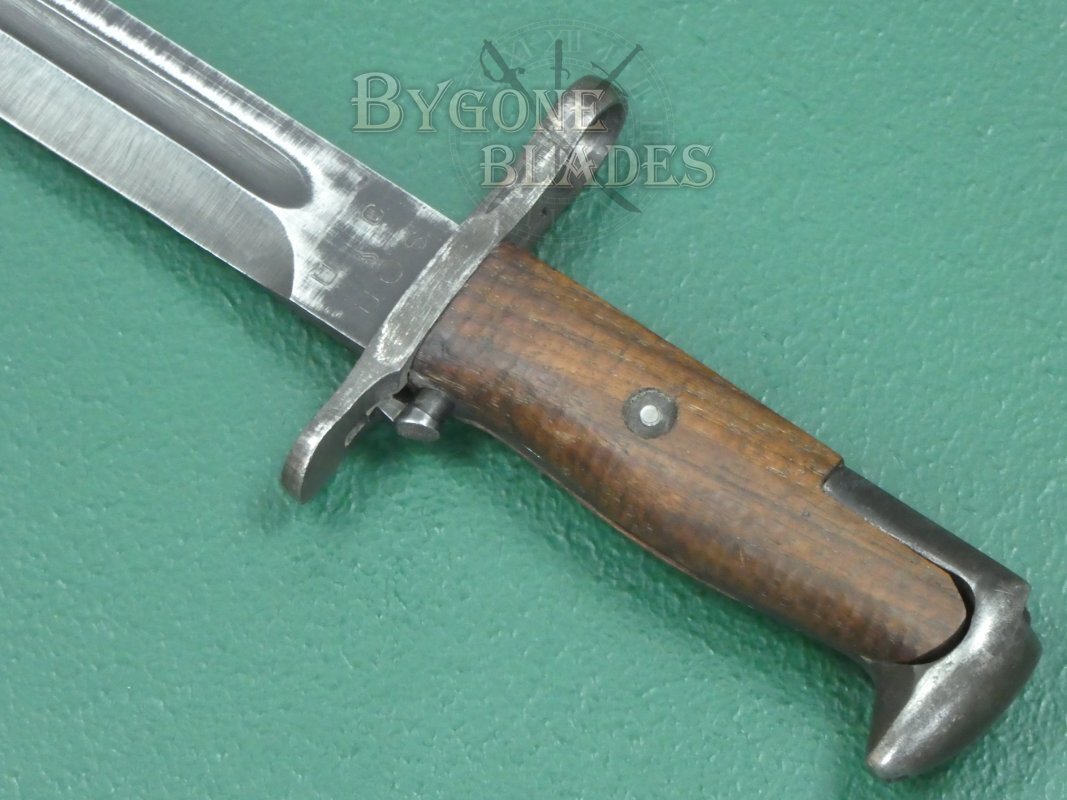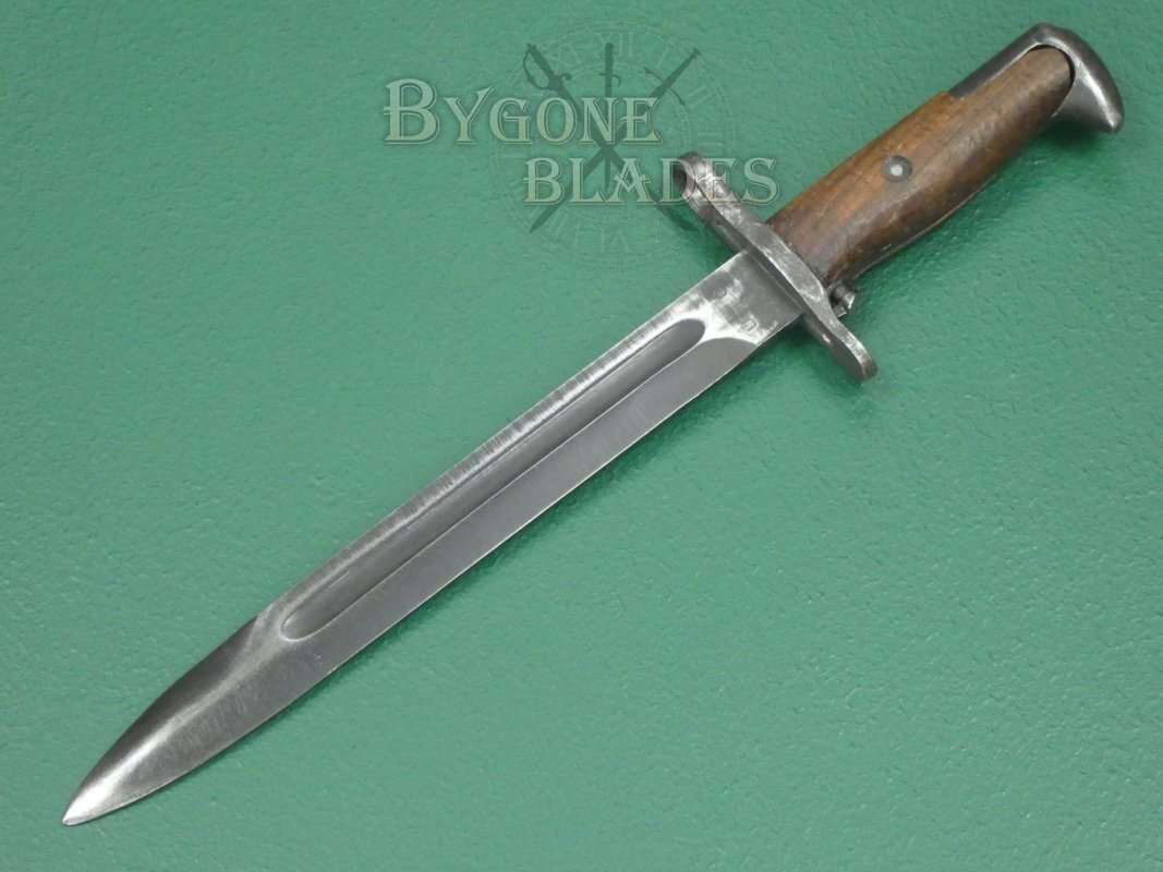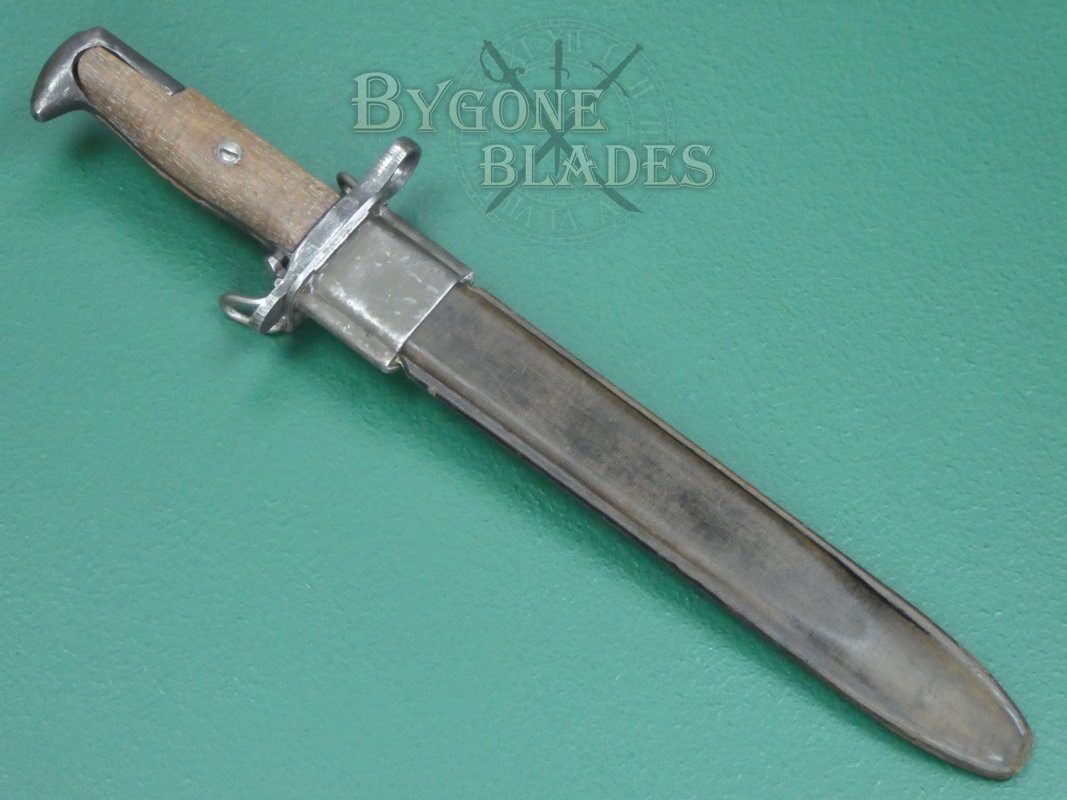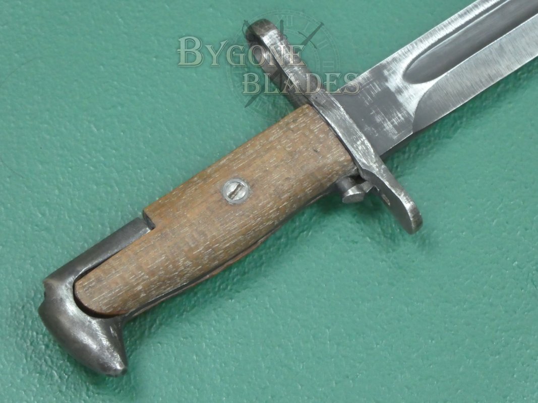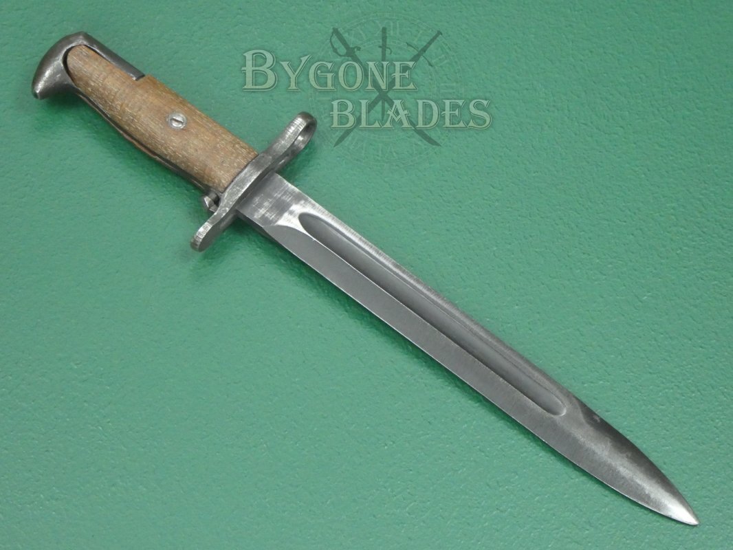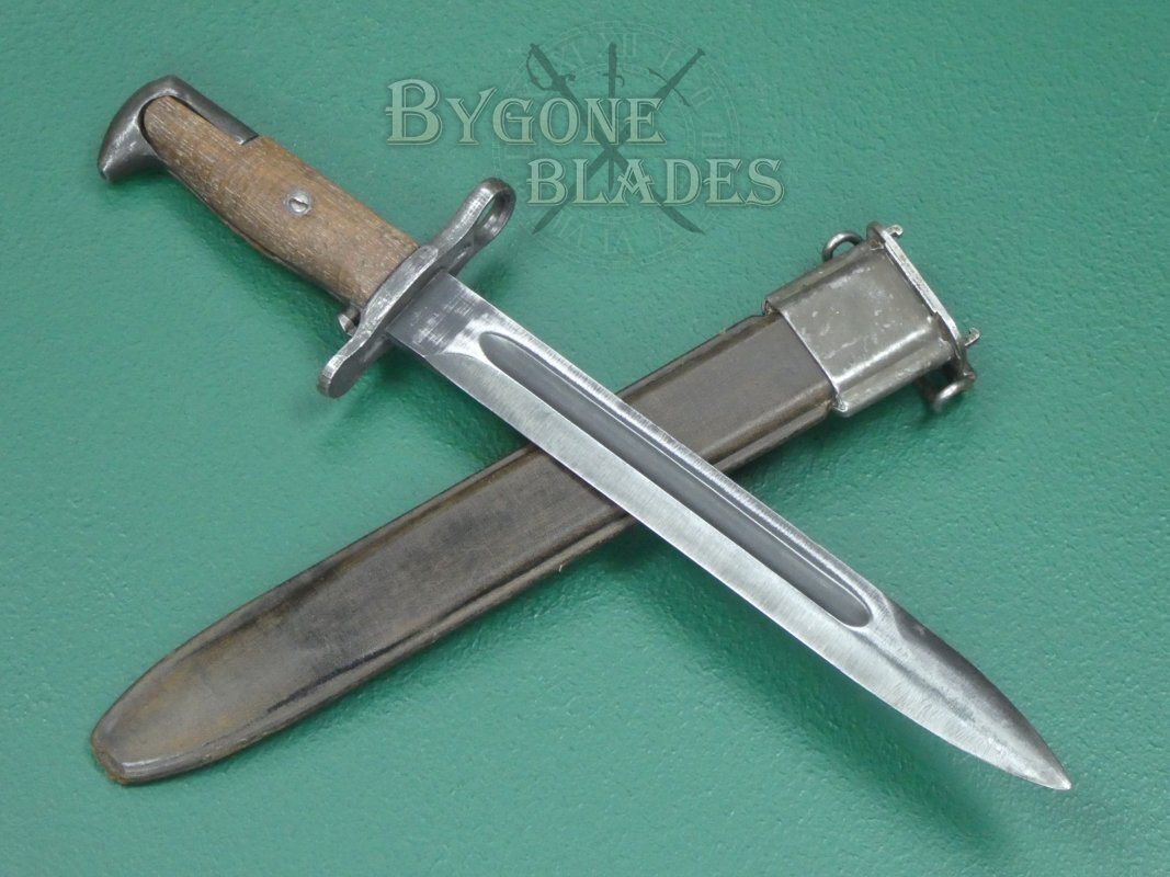 The American M1 Garand rifle was a staple of the US infantry during WW2. Initially, the M1 Garand rifle utilised the M1905 bayonet with its 16” (41cm) blade shortened to 10 inches (25cm). From 1943, new M1 bayonets were produced with a 25cm blade.