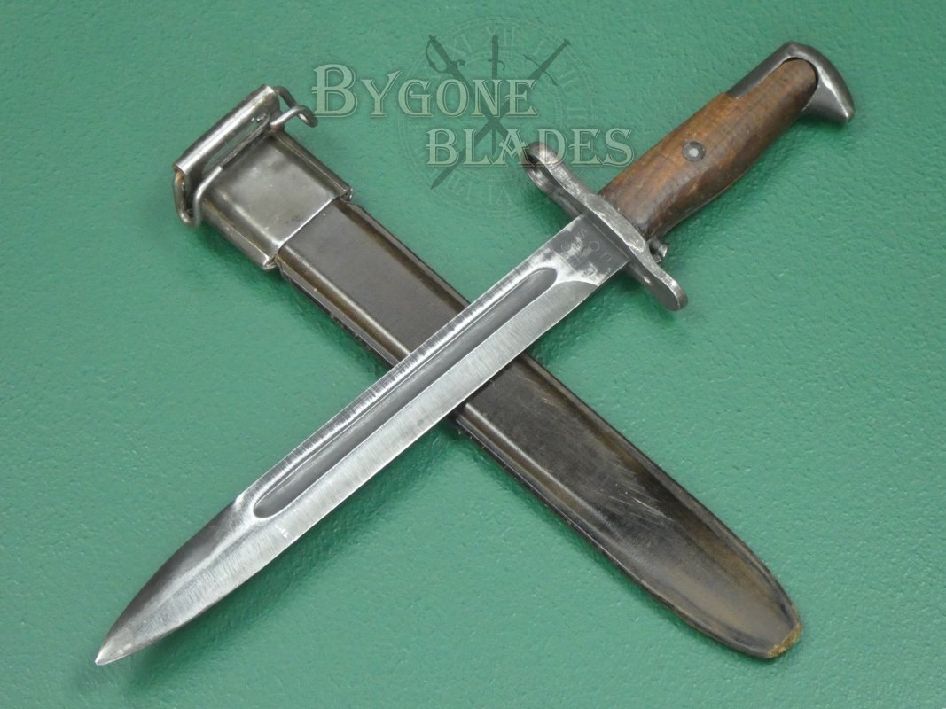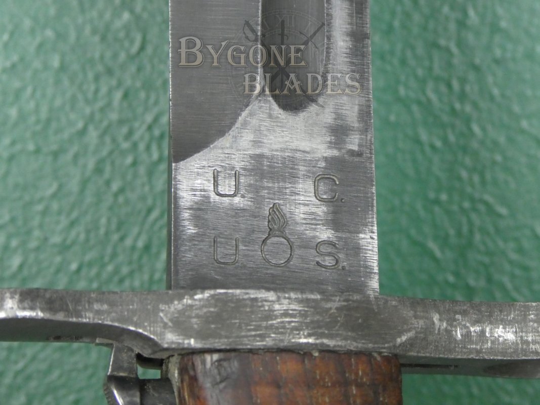 This bayonet was made by the Utica Cutlery Co. The bayonet utilises the hardwood grips of the M1905 suggesting that its manufacture was early in 1943 while stocks of the M1905 bayonet grips were still available. Later production bayonets have plastic grips.