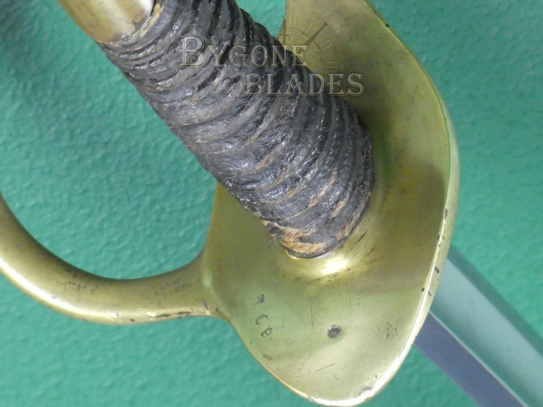 The heavy, three-branch brass hilt is stamped on the back of the beaked quillon with the number 602. There is also a small unidentified stamp and the crudely scratched initials H.R.E. The guard is in good condition and exhibits a beautiful and untouched patina. The grip is in reasonable condition for its age and use. The grip is without its twisted brass wire. The original leather is in good condition with some age and use related marks and a small loss at the front. The leather covers a wooden handle wrapped with cord for added grip. The peen is undisturbed.