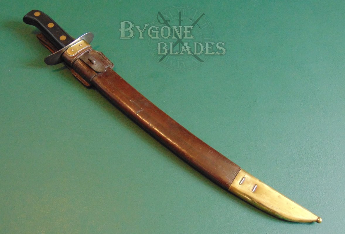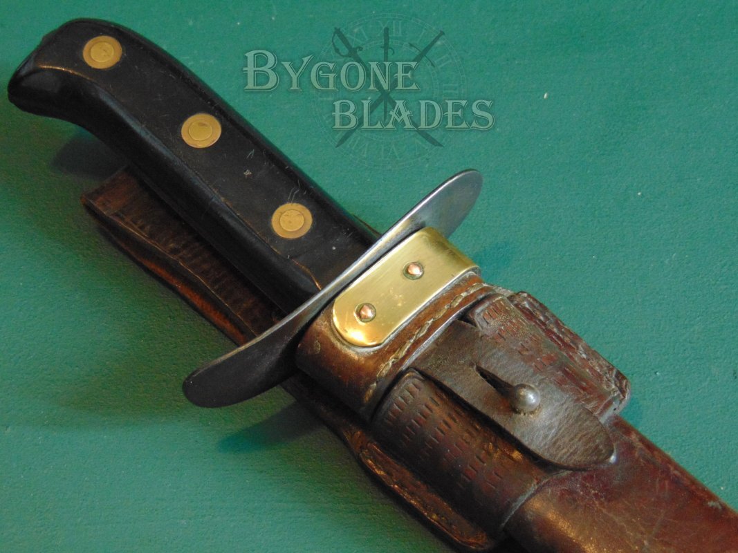 The blade is held firmly between two black Bakelite grip scales which are secured by three brass rivets. The screw that would have initially secured the bowl guard to the hilt is still present on the pommel.