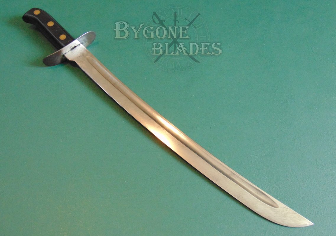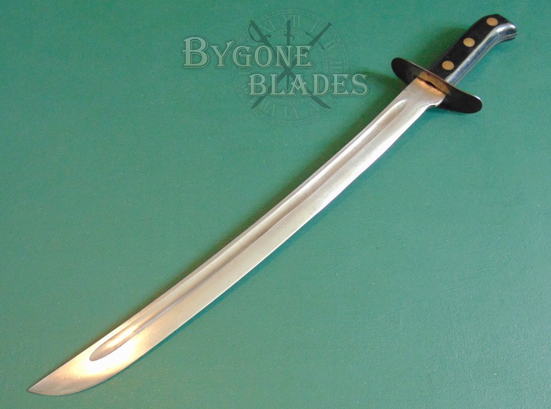 The unmarked, 452mm single-edged blade is slightly curved and has a flat spine above a deep single fuller. The blade terminates in a hatchet point and is in very good condition and retains a sharp edge.