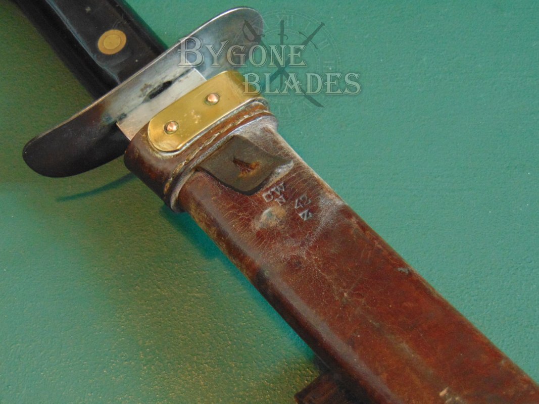 The short sword is complete with its brown leather scabbard with brass reinforced throat and integral frog stud. The scabbard is in excellent condition and retains its leather frog strap, something that is usually lacking. The scabbard is stamped with the manufacturing date of January 1942. The scabbard is complete with its scarce leather frog.