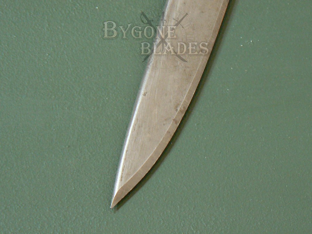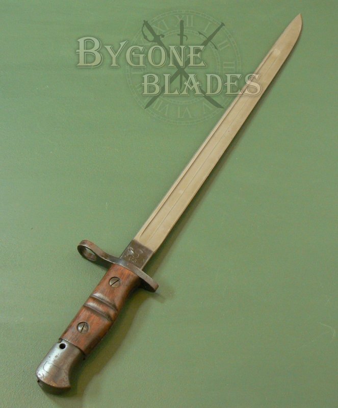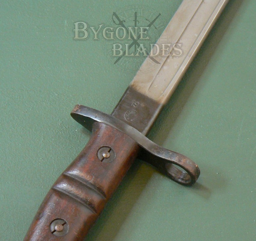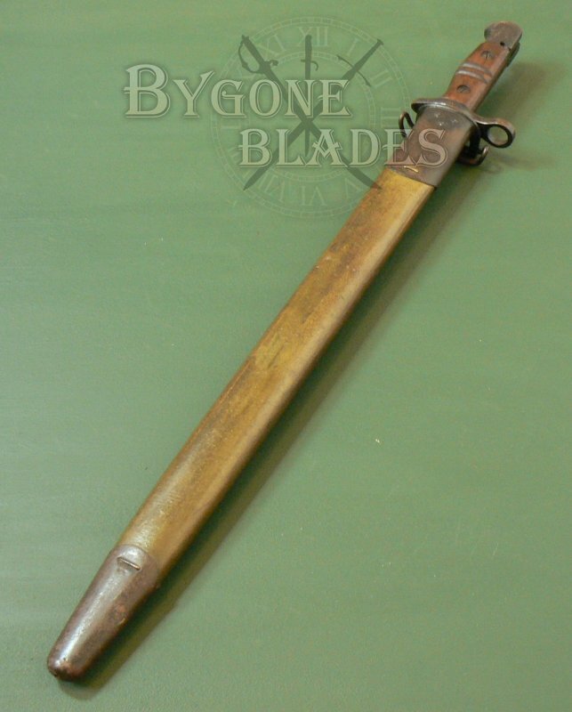 The bayonet is complete with its original green leather scabbard, which is also in near mint condition. The throat and chape retain their original blueing with minor rust and the green leather is firm and undamaged with the stitching intact and strong.