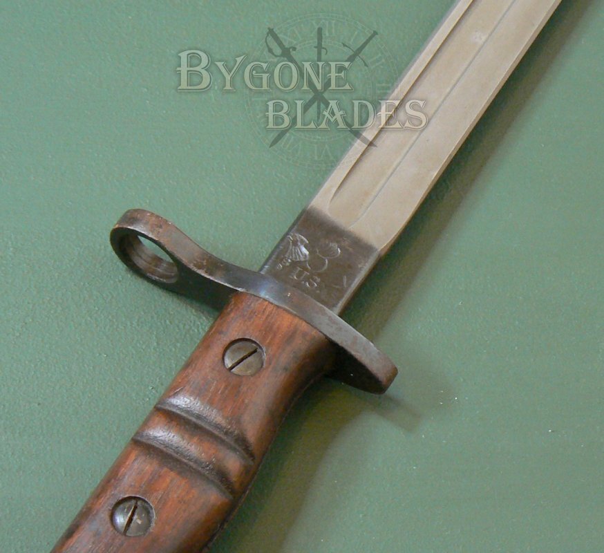 The blued ricasso is stamped with the pattern date of 1917 and the Remington maker's mark. The obverse ricasso bears the flaming grenade over US ordnance stamp, the eagle, bend test and inspection stamps. The cross guard and pommel retain their original blueing and the wooden hilt scales are unmarked. The press-stud locking mechanism works perfectly. There are traces of minor rust on the cross guard and pommel.