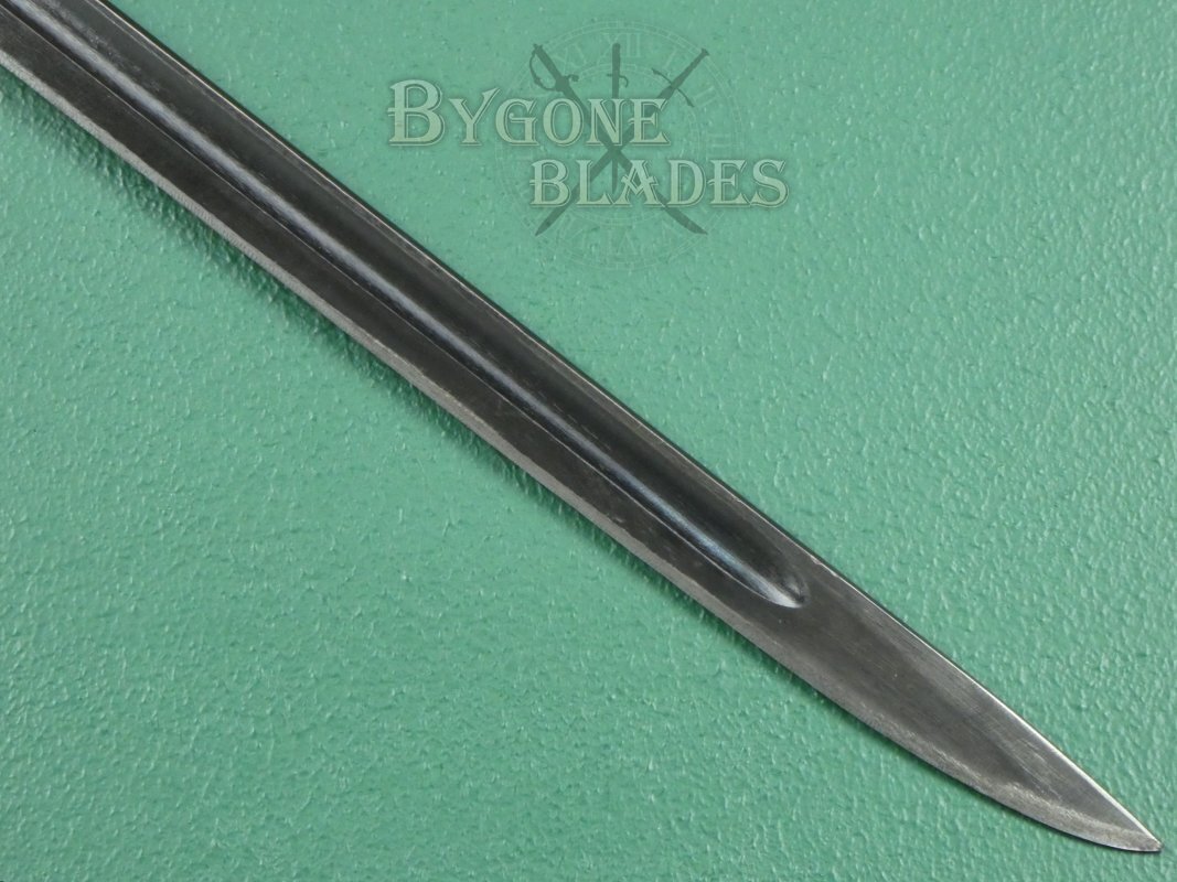 The bayonet is complete with its early production leather scabbard with a small round frog stud. The scabbard is in reasonable to good condition. The stitching is intact and strong. The steel locket and chape retain their original blueing.