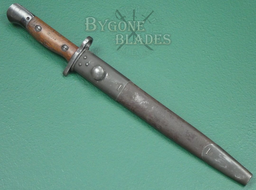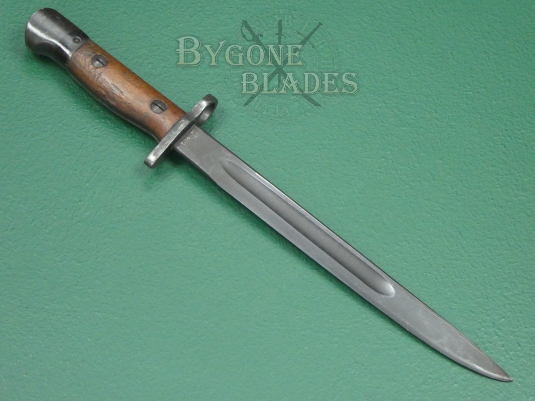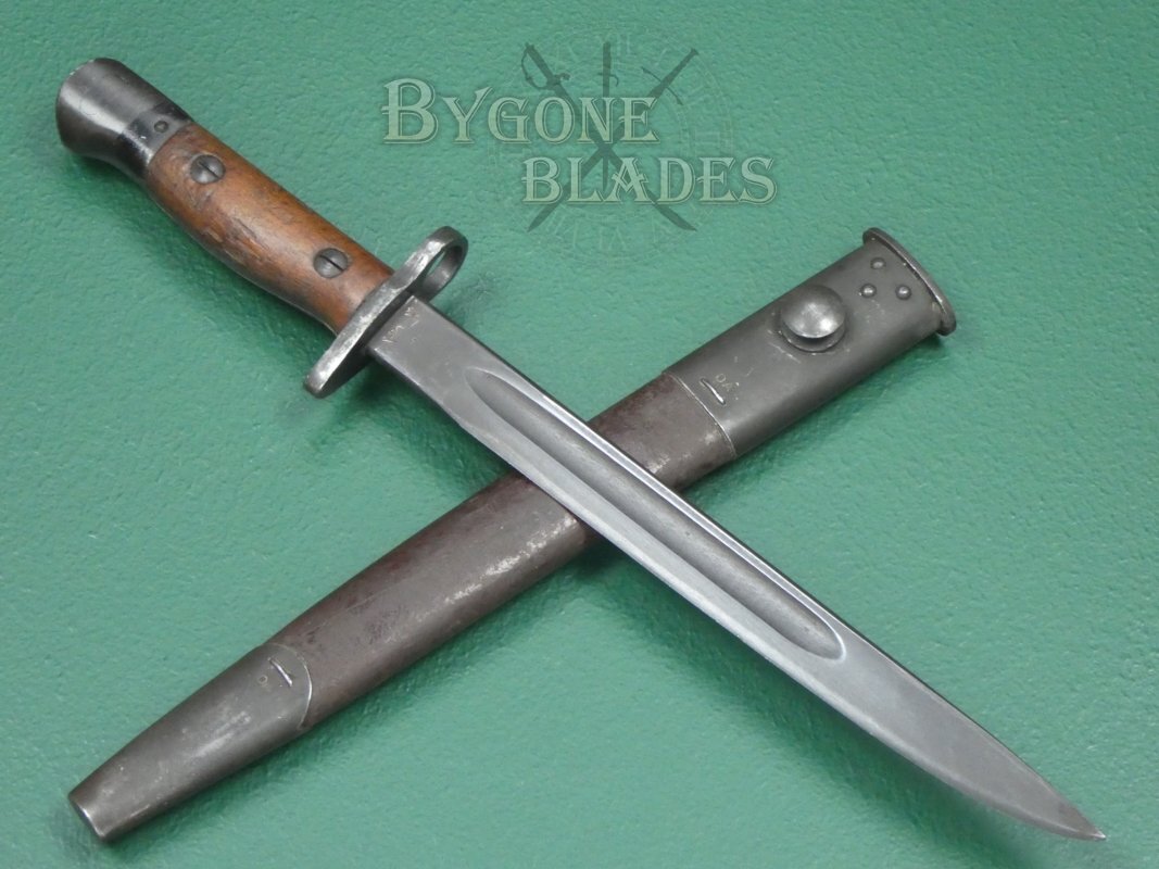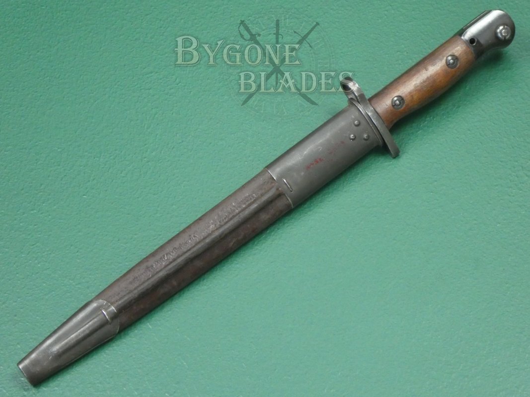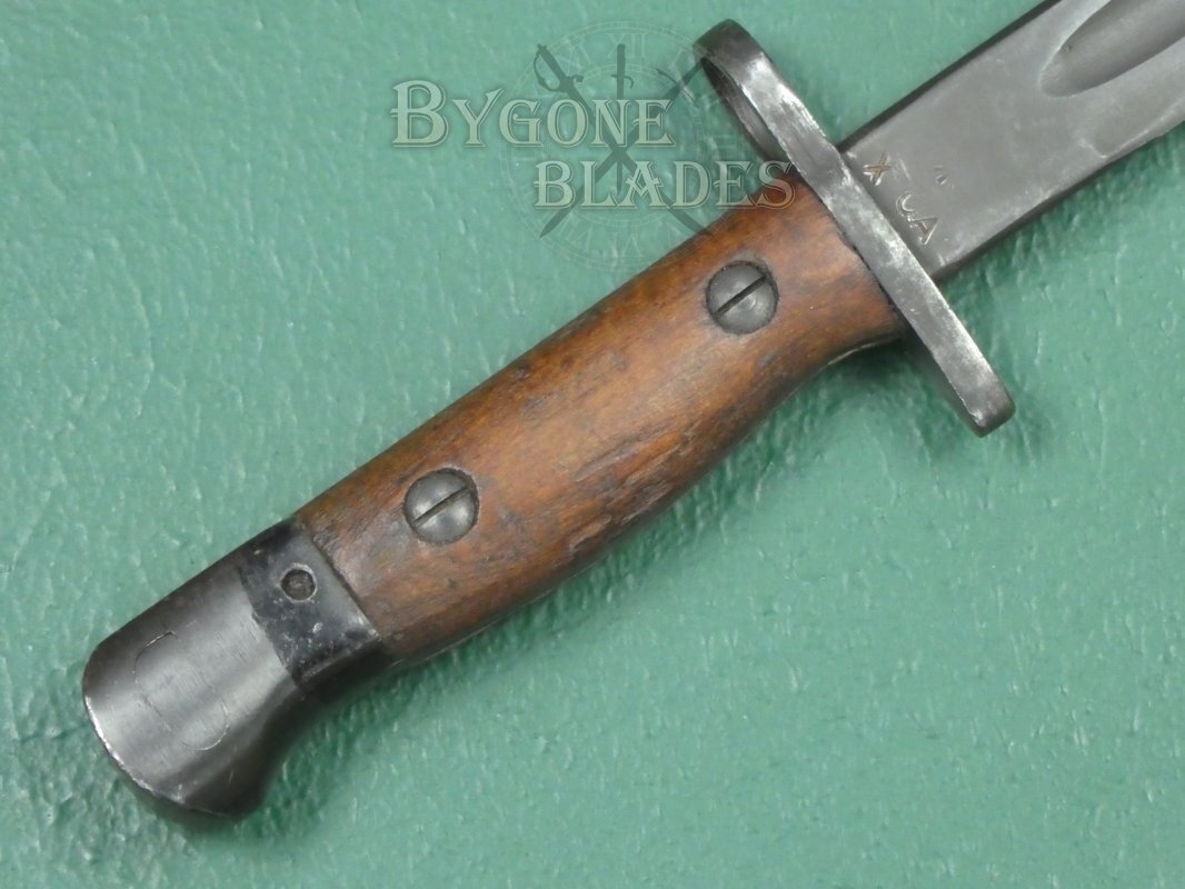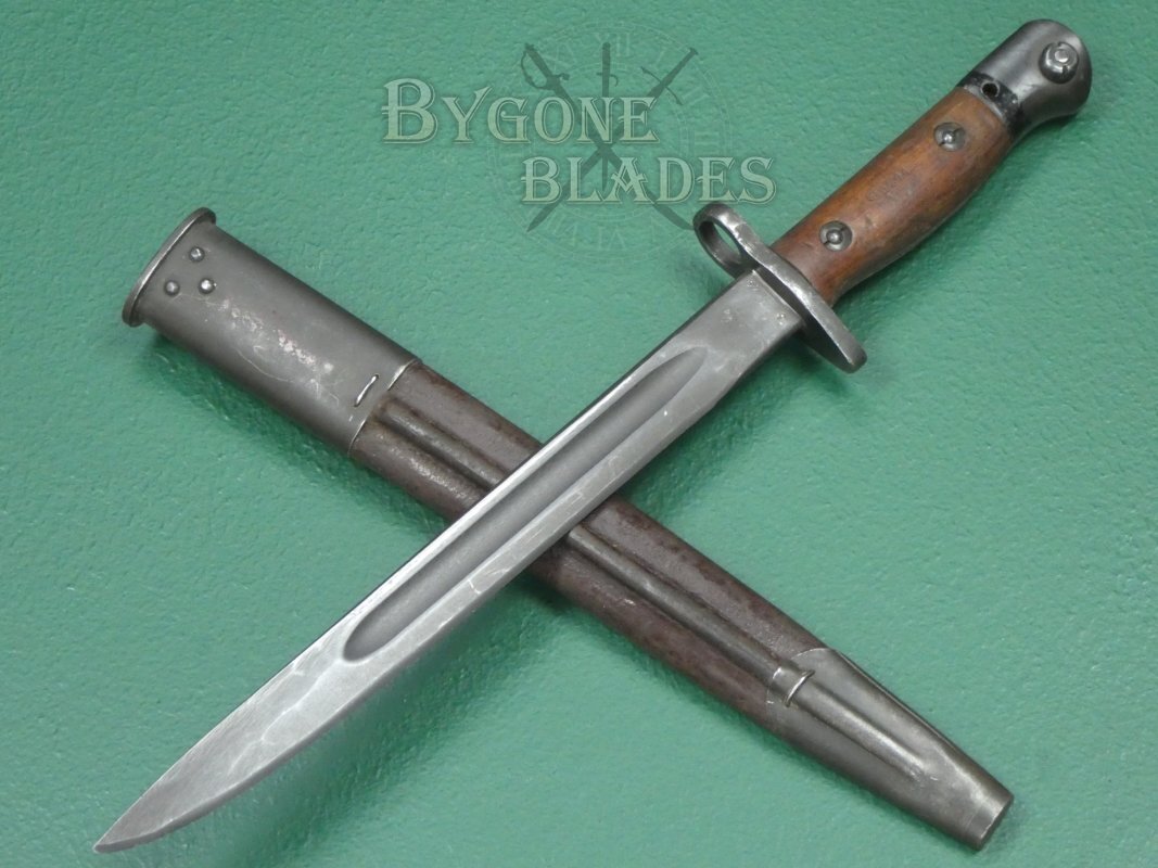 The Mk1 had a newly made blade. The Mk1/1 (originally designated Mk2) has a shortened 1907 pattern (No.1 bayonet) blade. Wartime production of the Owen bayonet was at the Orange factory. Post war production was at Lithgow in 1953.