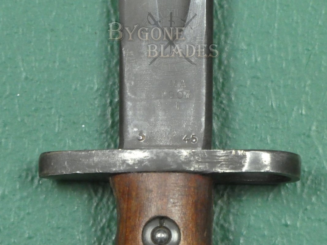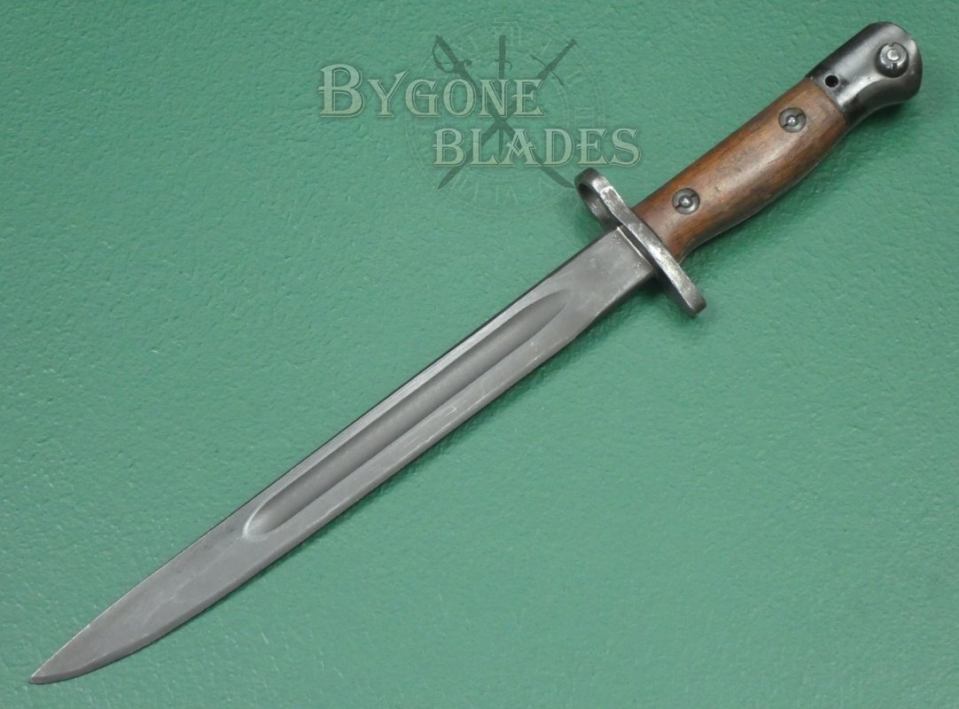 The Australian Owen Mk1 submachine gun bayonet is essentially a shortened No.1 (1907 pattern) bayonet and was agreed in August 1944 and notified in General Orders in February, 1945. Production began in February 1945. By mid-April 1945, only 19,000 Mk1 and Mk1/1 bayonets had been produced.