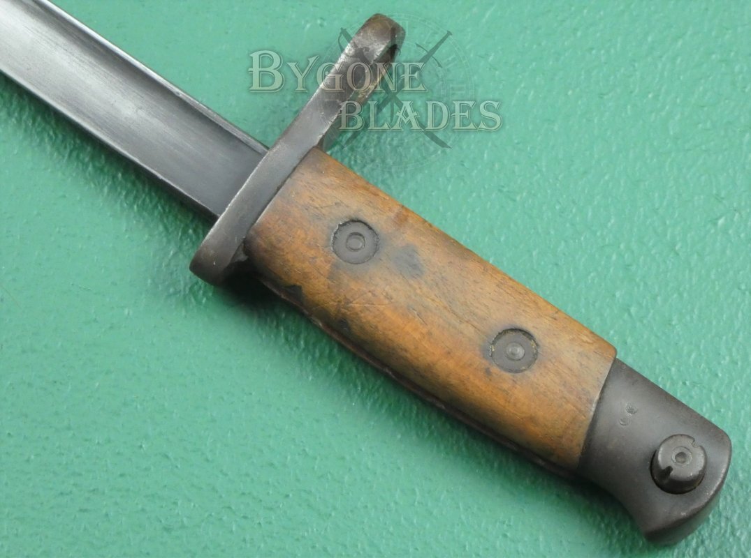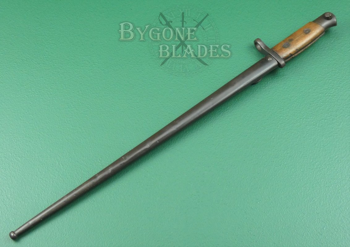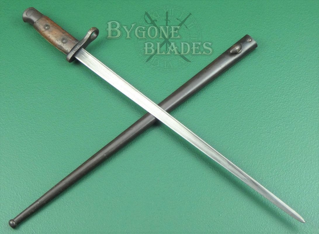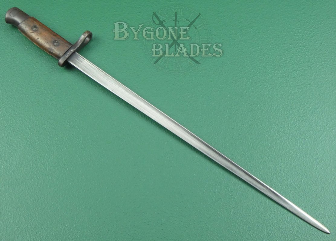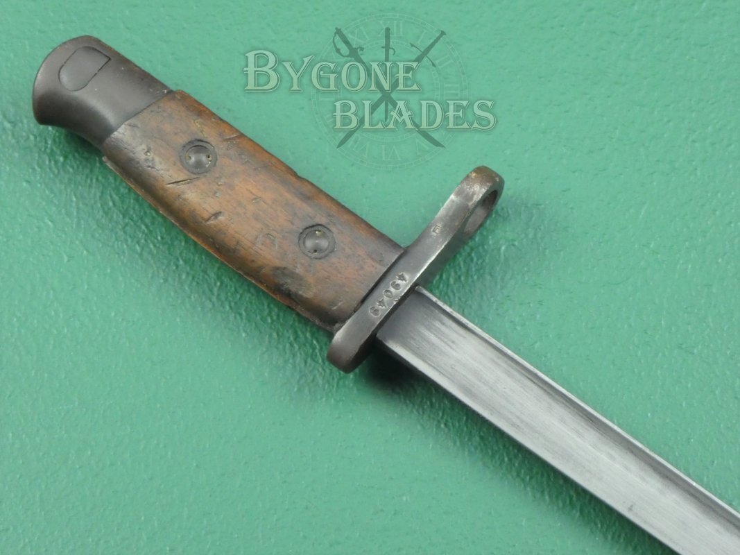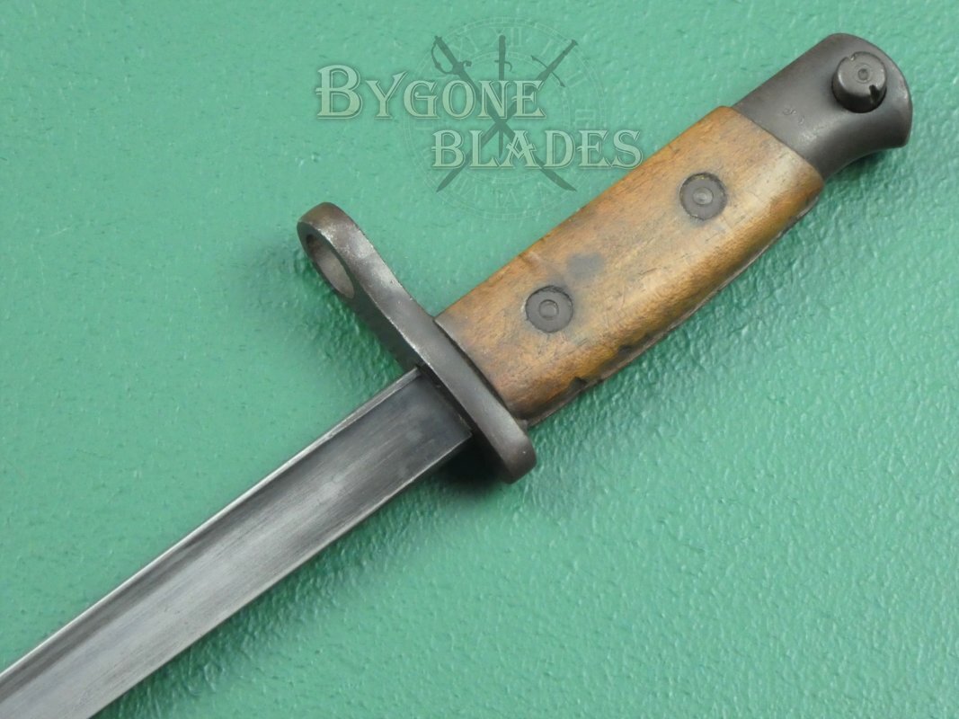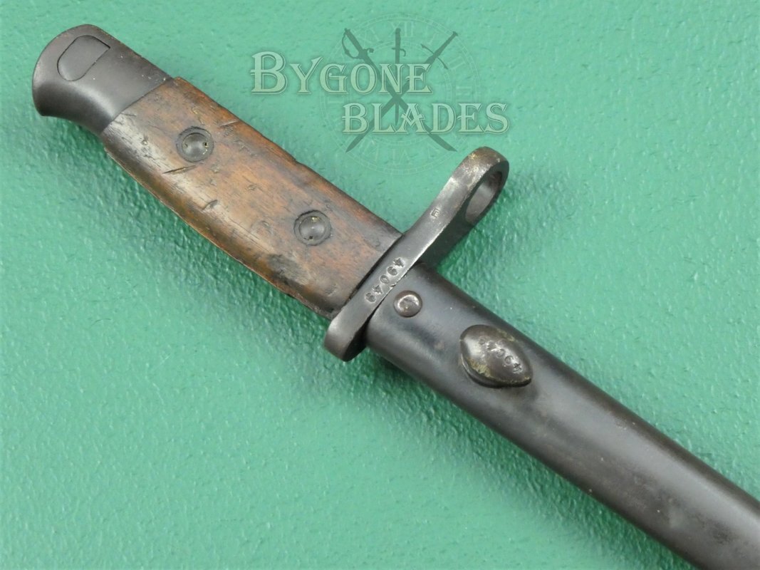 These scarce Belgian model 1916 bayonets were produced in England and France during WW1, between 1916 and 1918. The Belgian state armoury was forced to move production to factories in Calais, France and Birmingham, England after the evacuation of their Liege factory in 1914.