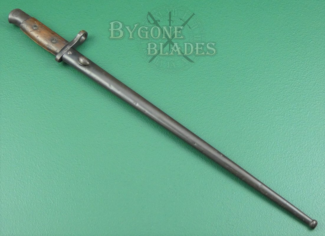 The 448mm T-section blade was adapted from an earlier French M1874 Gras rifle bayonet. The blade is in excellent condition.
