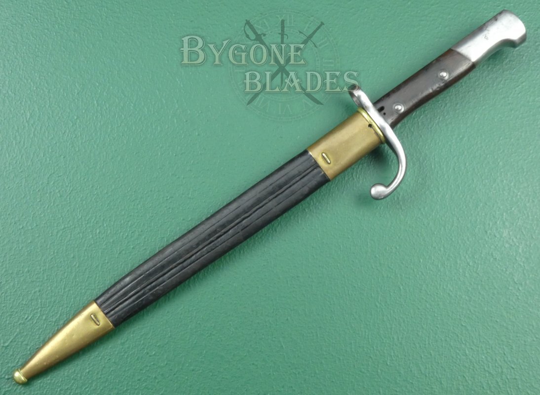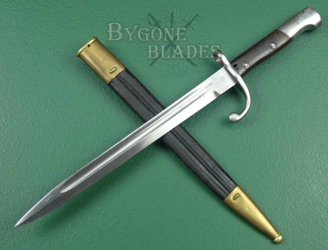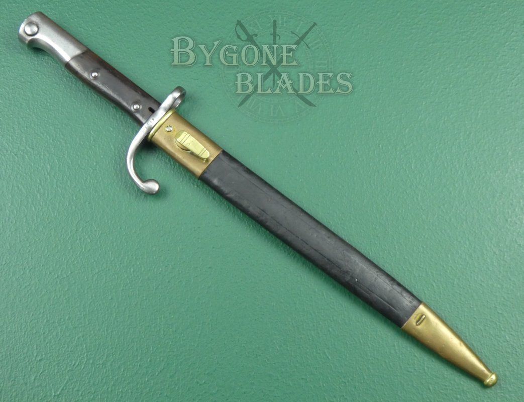 The bayonet is complete with its black leather scabbard with brass locket and chape. The scabbard is in very good condition and the bayonet sheathes and draws smoothly and is held firmly within.