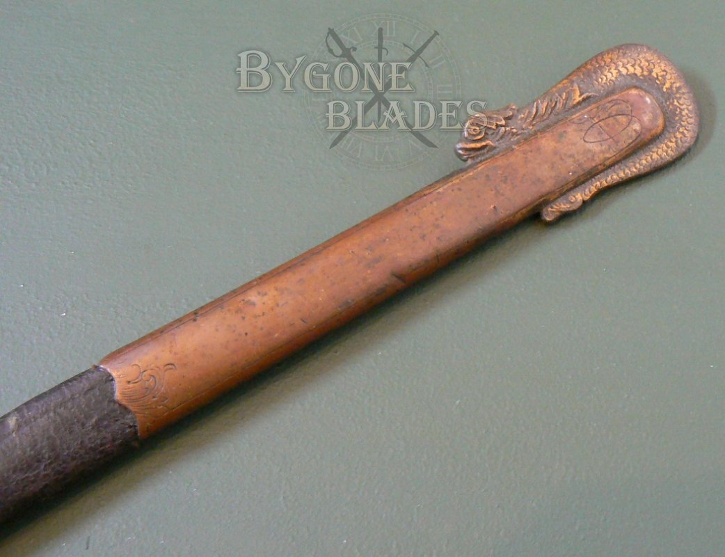 The gilded brass mounts are beautifully detailed. The throat and middle mount are etched with a foliate design with knotted ropes holding the scabbard rings. The scabbard drag is in the form of a dolphin.