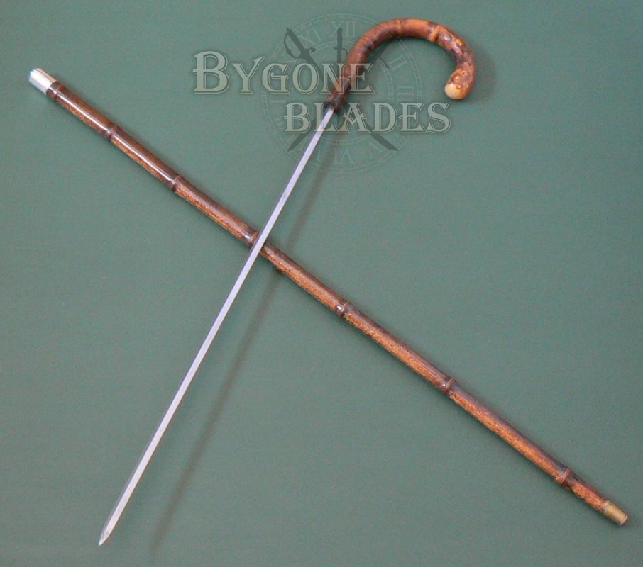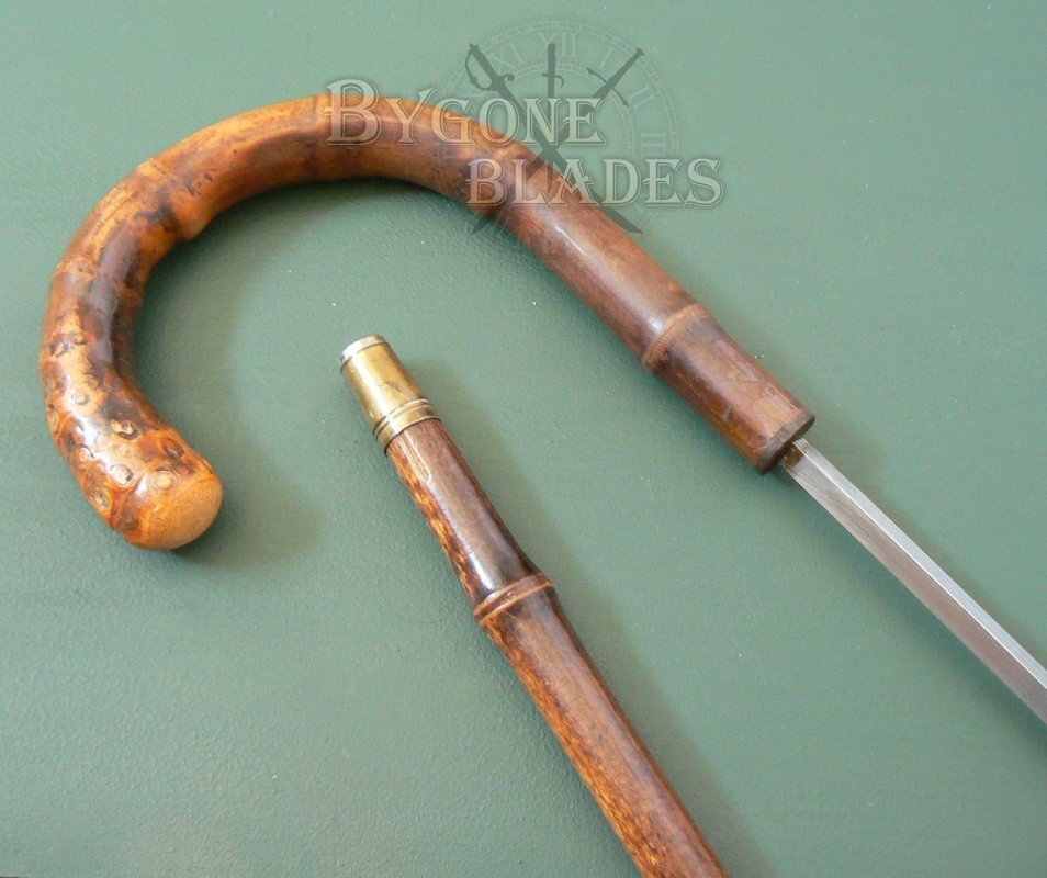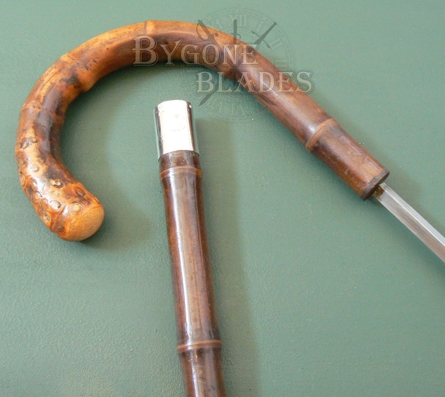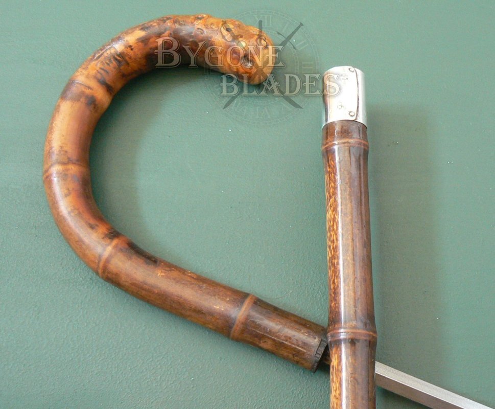 The cane is 86.5cm long and conceals a 50 cm diamond section blade with a needle sharp point. The blade is in good condition with minimal speckles of tarnish, which could easily be polished out. The blade sheathes and draws smoothly and is held firmly within the cane.