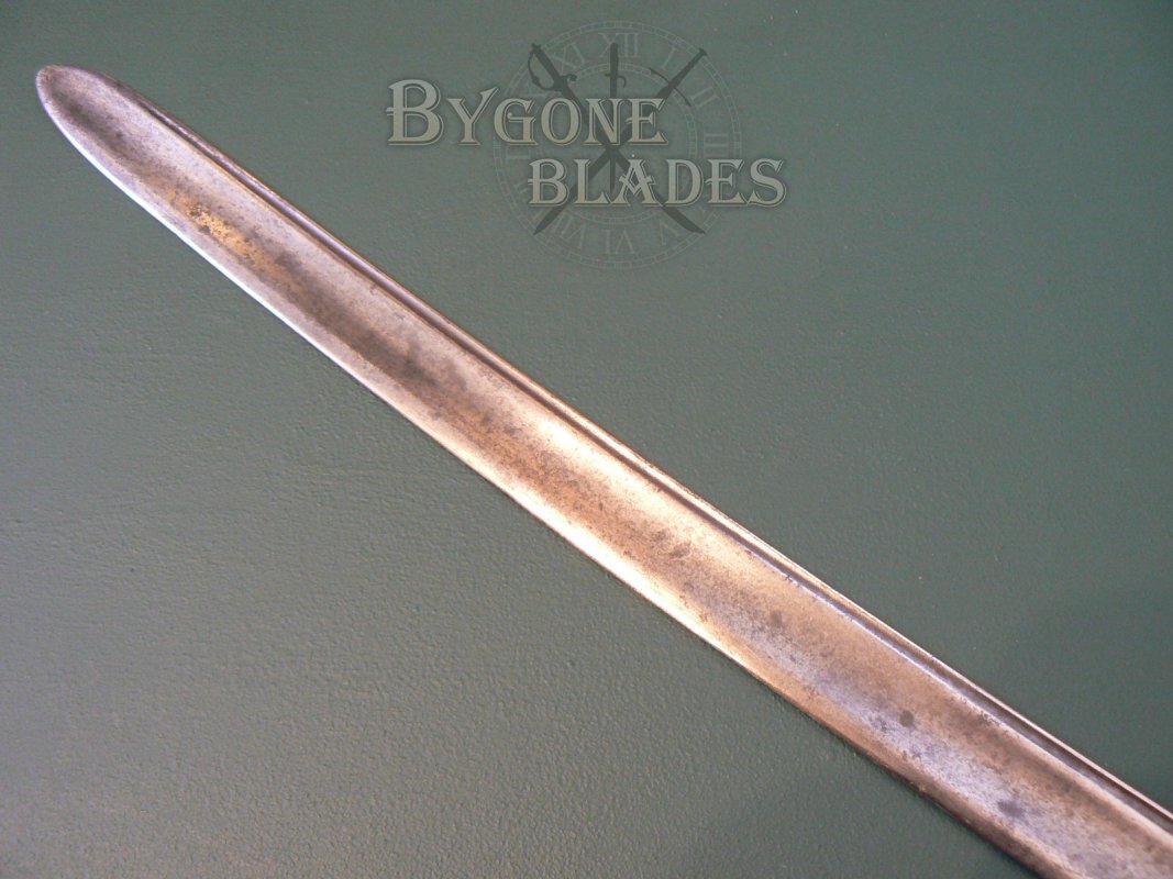 The bronze stirrup hilt is of the style designed by Francis Thurkle in the 1780’s. There is a hairline crack in the middle of the knuckle bow. The contoured ivory grip is in good condition with two short hairline cracks near the grip collar and a small chip where it joins the pommel. The ivory has the patina of age and use. What looks to be cracks in the ivory are actually remnants of eight engraved lines, originally stained black.