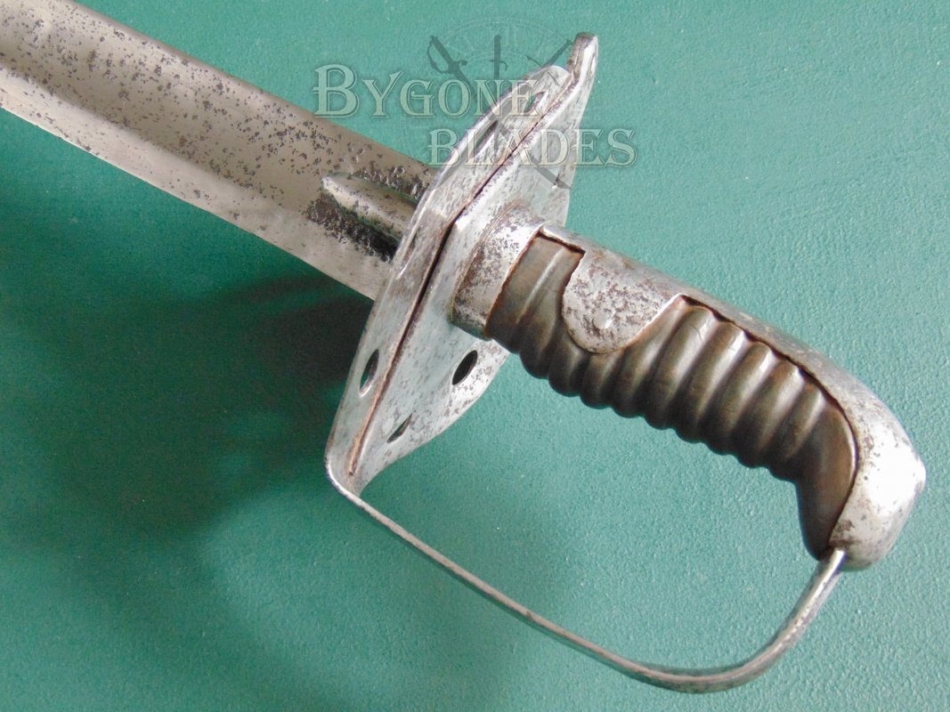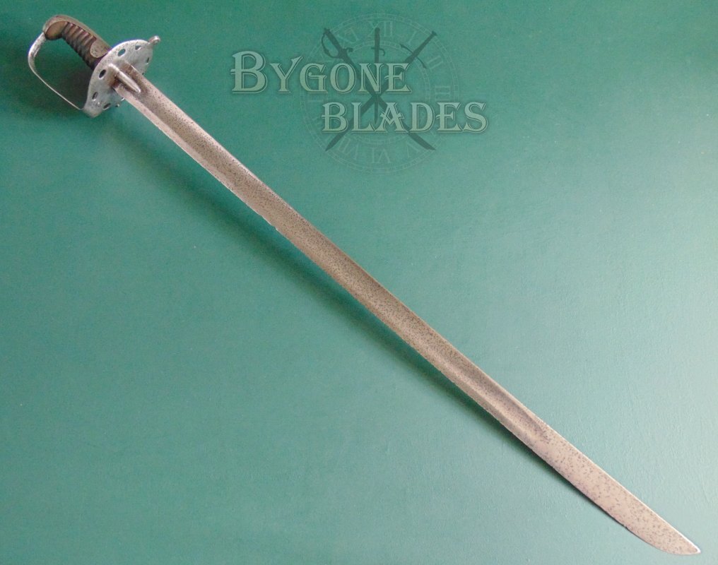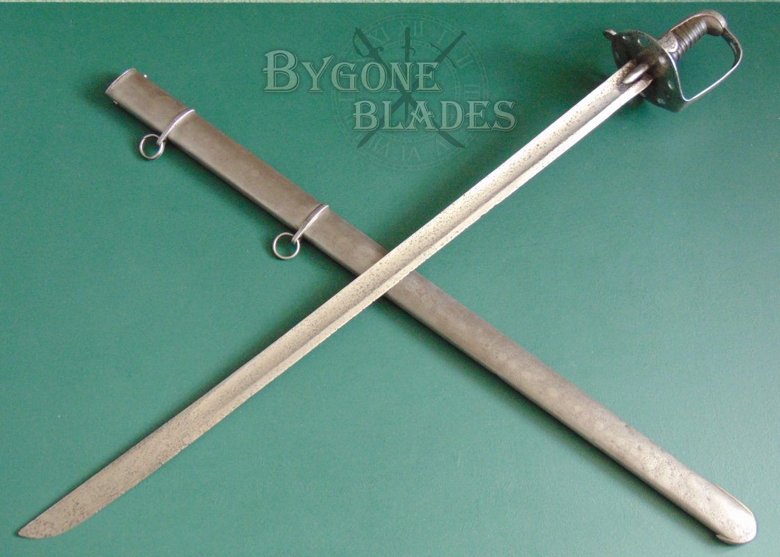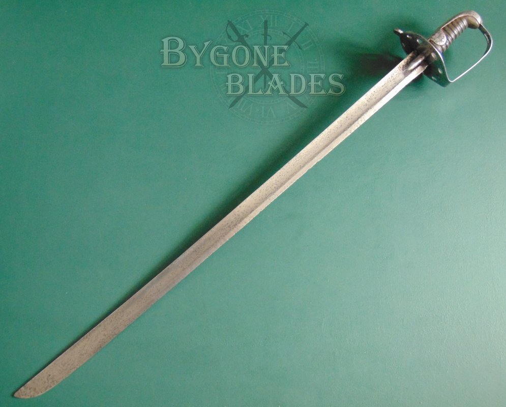 The 888mm single-edged blade has a flat spine above a broad, shallow fuller and terminates in its original hatchet point. From 1812 onwards, many heavy cavalry swords had their original hatchet points ground to spear points. A general order to re-point the blades of their swords was also issued to the heavy cavalry prior to the Battle of Waterloo in 1815, making unaltered models harder to find today.