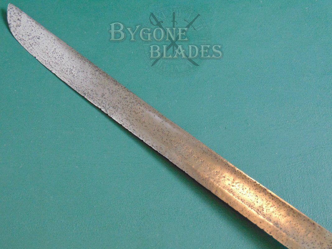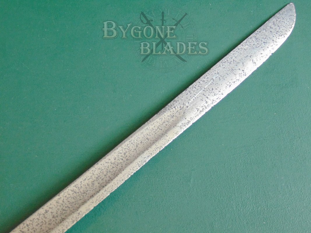 The blade is in reasonable to good condition for its 200+ years of age and almost certain battle service, with a salt and pepper patina and shallow pitting along its length on both sides. The blade was sharpened and has edge nicks consistent with service use. The blade has been cleaned which has removed any maker’s details, if indeed they were present to begin with.