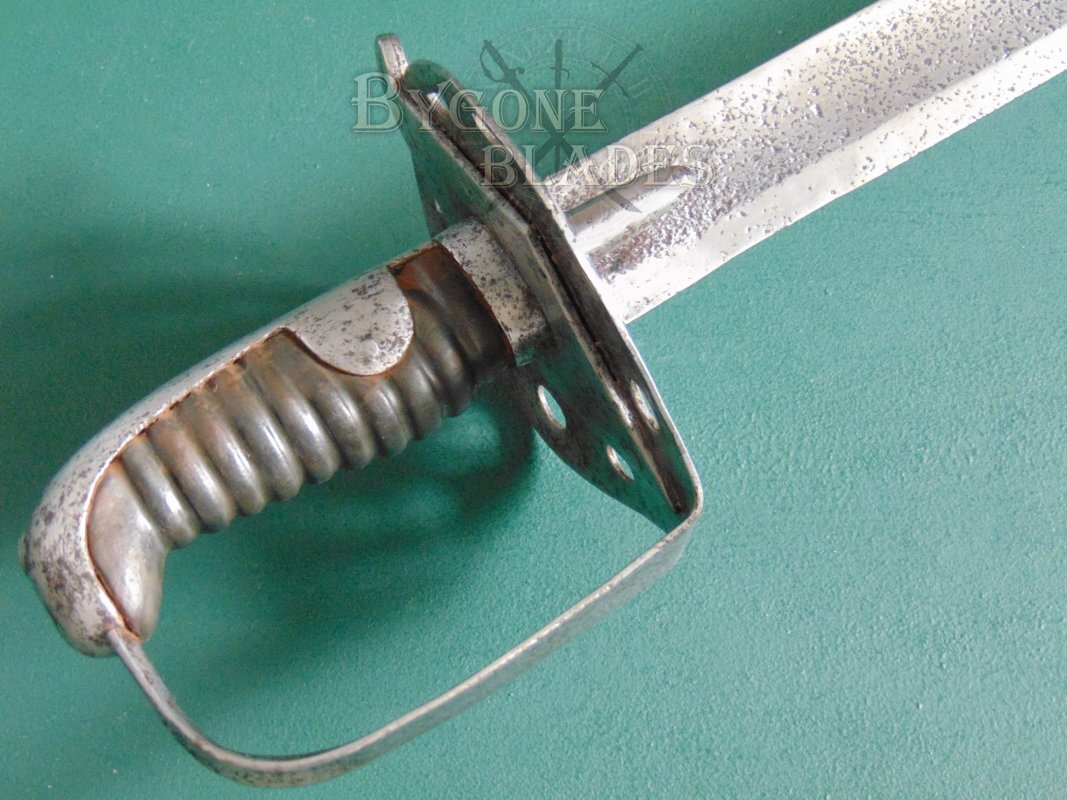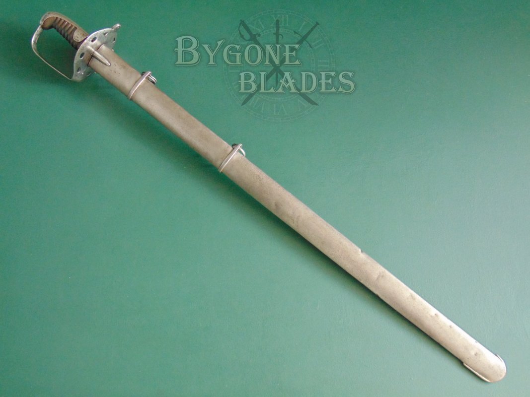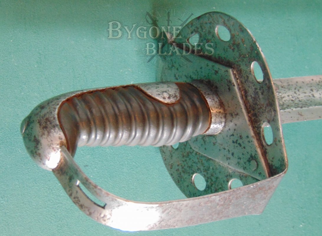 The sword is complete with its steel scabbard which is marked to F troop of the 3rd Dragoons. The scabbard is in overall good condition with slight dings and some pitting. The sword sheathes and draws smoothly and is held firmly within the scabbard. The two suspension rings are likely replacements although Gill, one of the primary Birmingham makers is known to have used this style of ring on their scabbards.