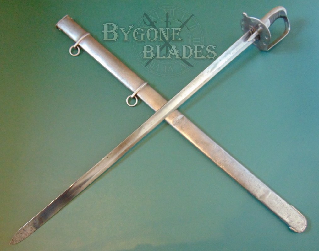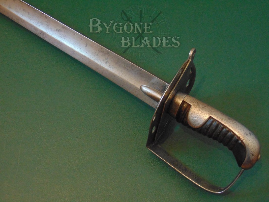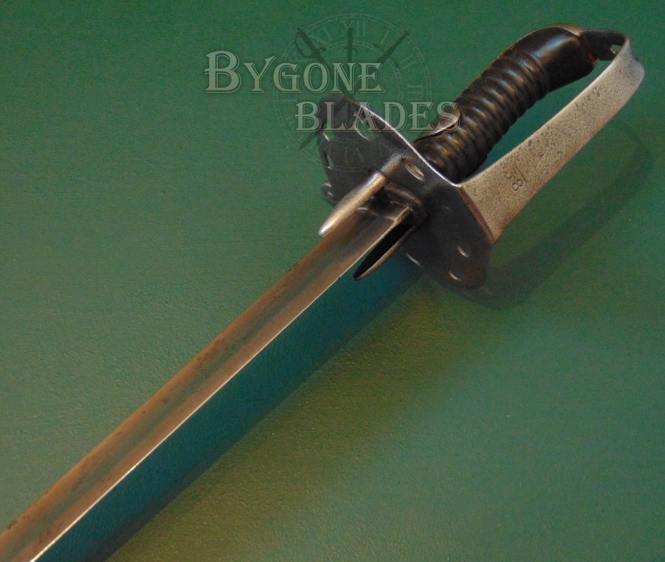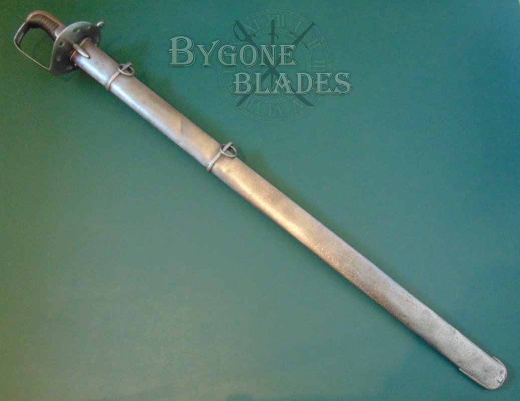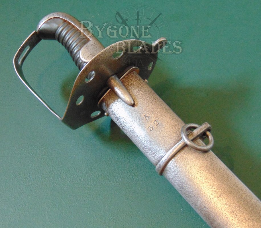 The sword is complete with its steel scabbard which is marked with the letter A over the numeral 32, indicating that although the scabbard is not a direct match for the sword, both sword and scabbard were issued to A-troop of the same heavy cavalry regiment. The scabbard was probably inadvertently swapped when the regimental armourer re-pointed A-troops blades. The scabbard is in good condition with some use related dings and all-over shallow pitting. The scabbard retains its internal wooden liner and the sword sheathes and draws smoothly and is held firmly within.