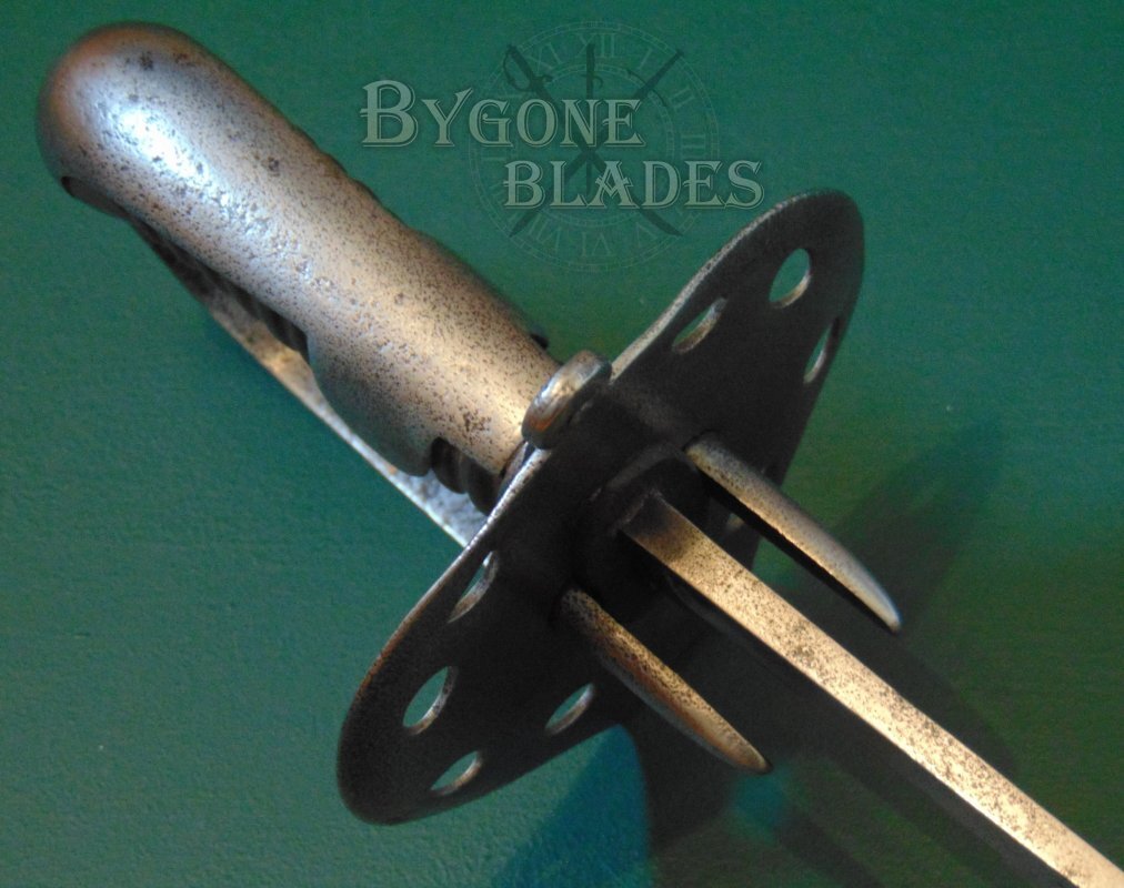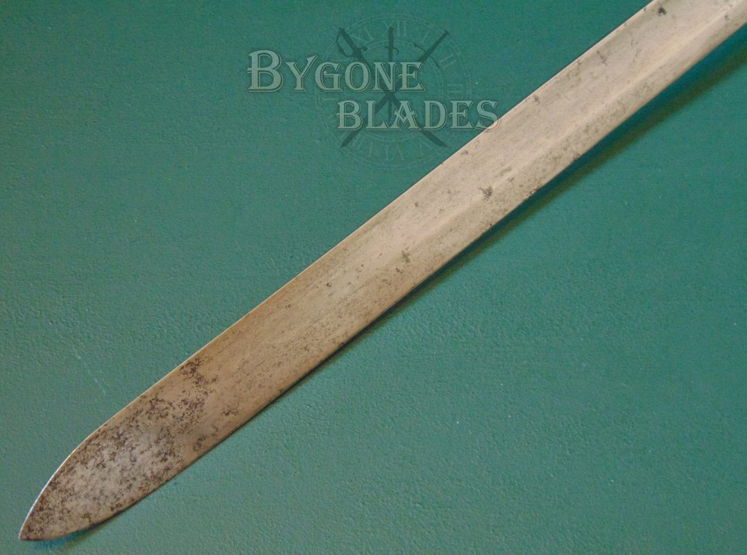 The blade is in very good condition for its 200+ years of age and almost certain battle service, with small patches of tarnish along its length and some darker tarnish and shallow pitting at the point on both sides. The blade was service sharpened and has a few tiny edge nicks consistent with service use. The blade has been cleaned which has removed any maker’s details, if indeed they were present to begin with. The forte bears a worn, crowned inspectors stamp and the spine bears two letters B, the first at the original balance point and the second further up the blade. I believe that the use of the B indicates that the sword was made in Birmingham. The blade retains its original washer.
