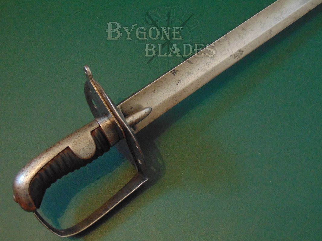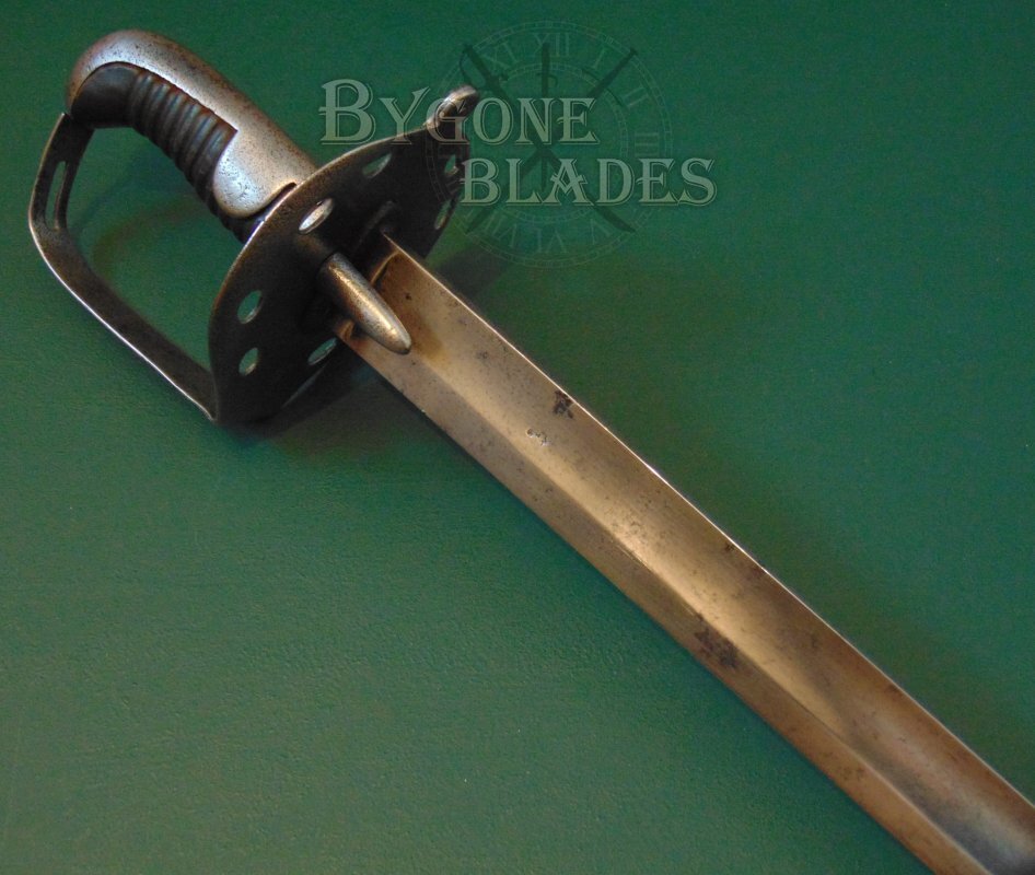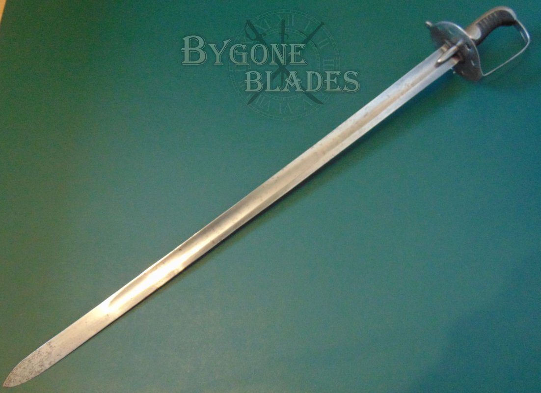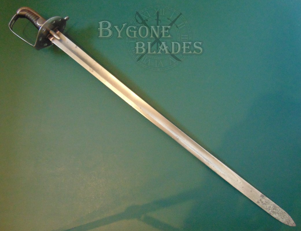 The 872mm single-edged blade has a flat spine above a broad, shallow fuller and terminates in a spear point. From 1812 onwards, many heavy cavalry swords had their original hatchet points ground to spear points. A general order to re-point the blades was also issued to the heavy cavalry prior to the Battle of Waterloo in 1815.