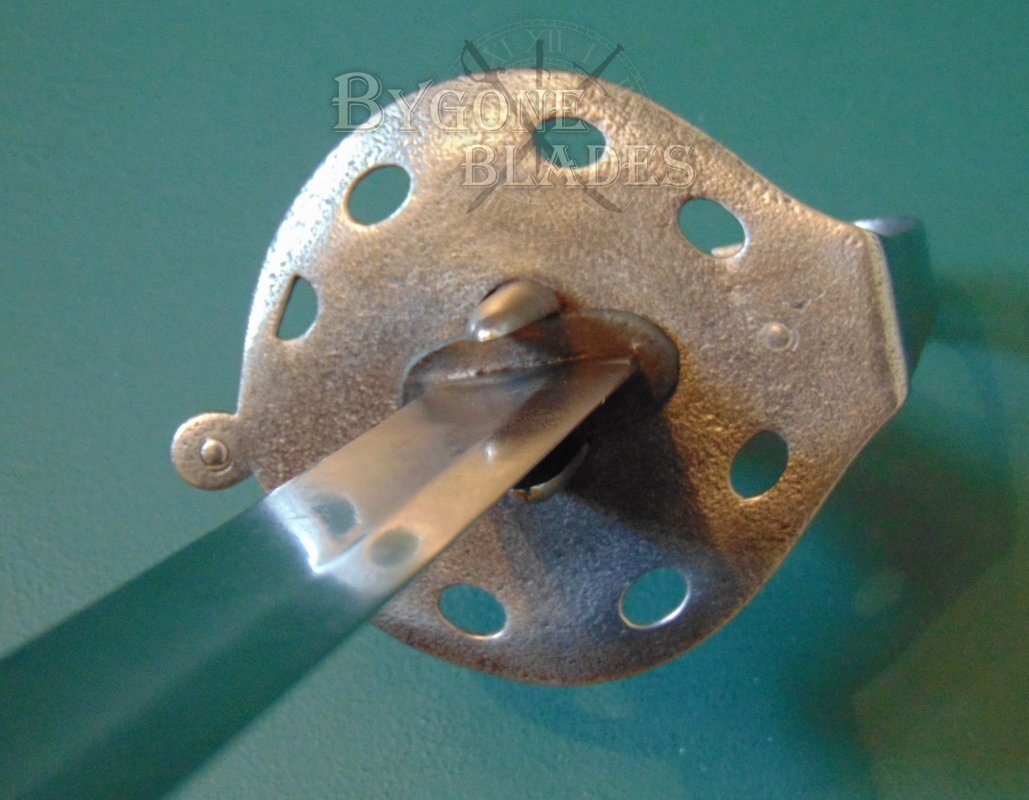 The steel disk guard is unmodified, retaining its languets and full disk shape. The knuckle bow is engraved with the letter A over the numeral 38. The hilt is firm and in good condition with shallow pitting. The leather covered grip is in very good condition and the blade is firm in the hilt.