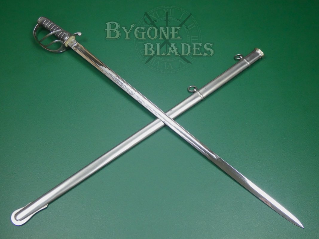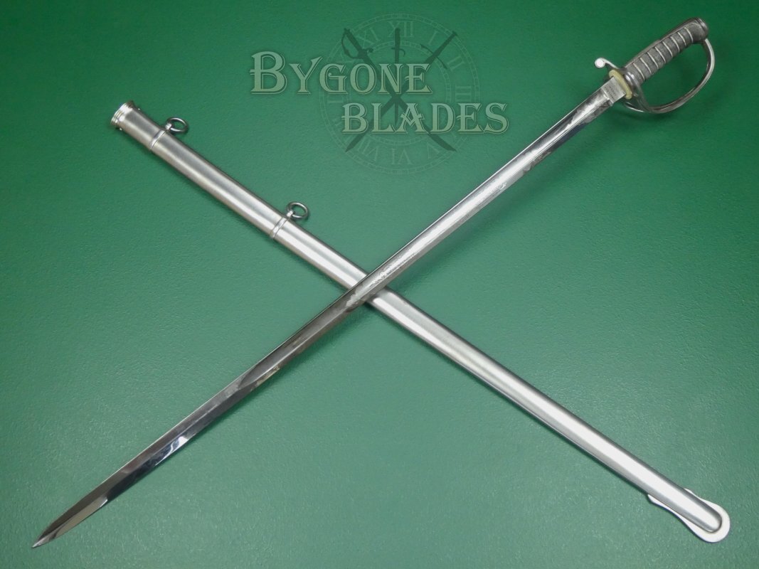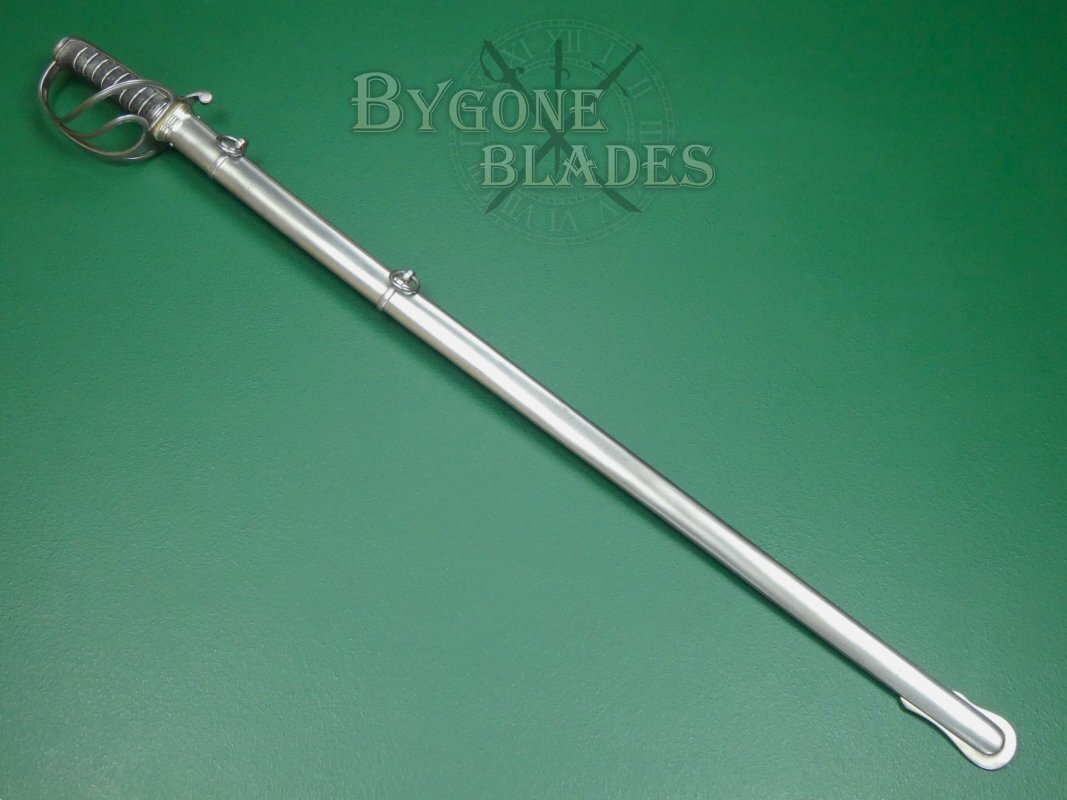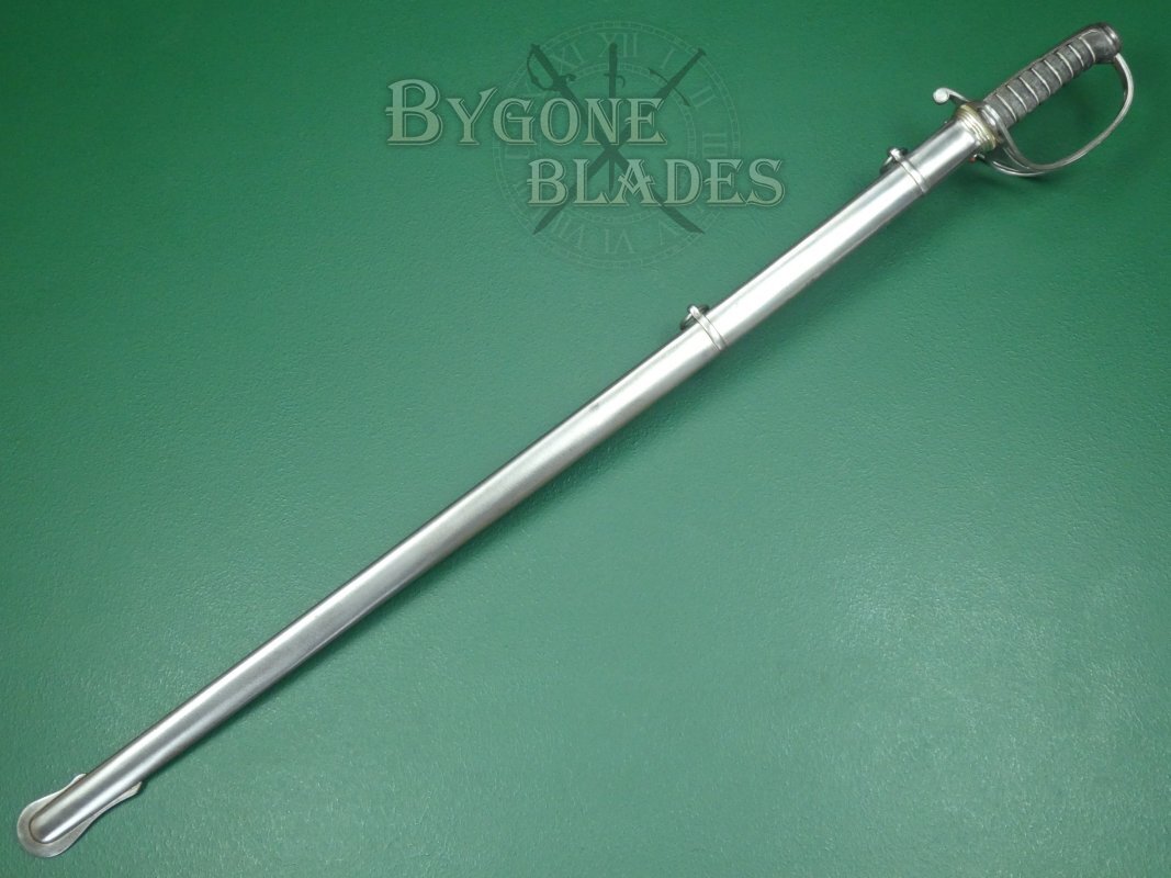 The sword is complete with its polished steel scabbard with twin suspension rings. The scabbard is in good condition with a pale speckled patina. The sword sheathes and draws smoothly and is held firmly within the scabbard.