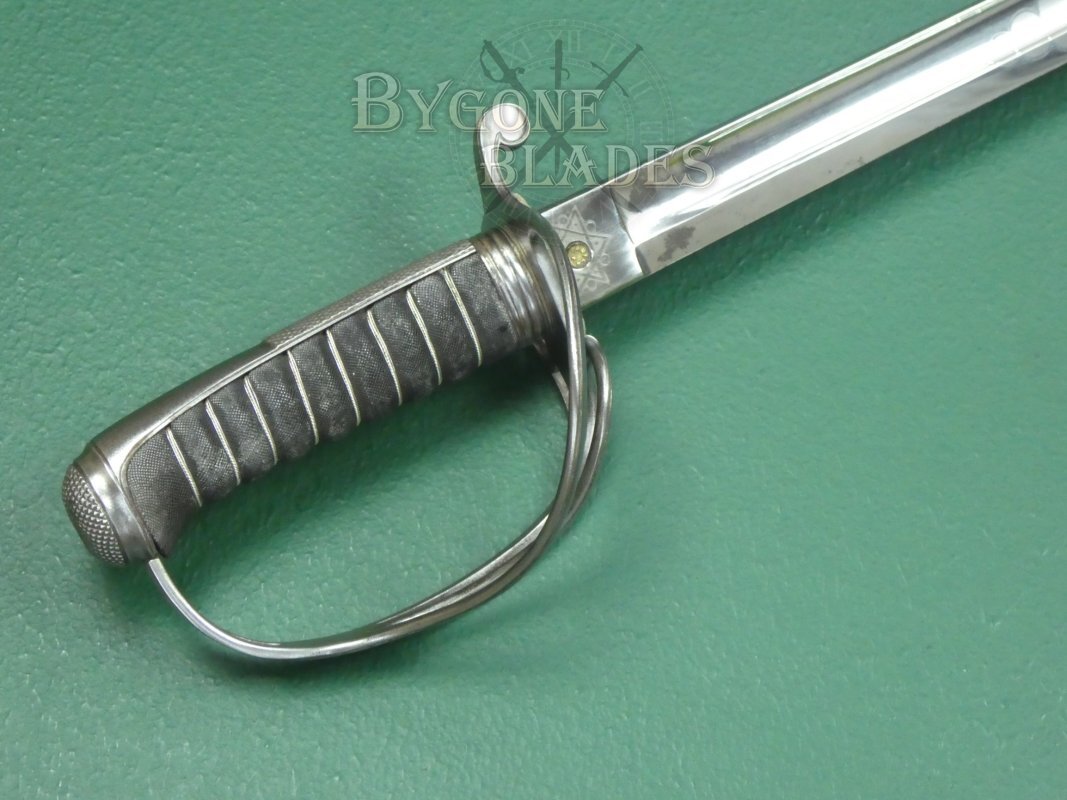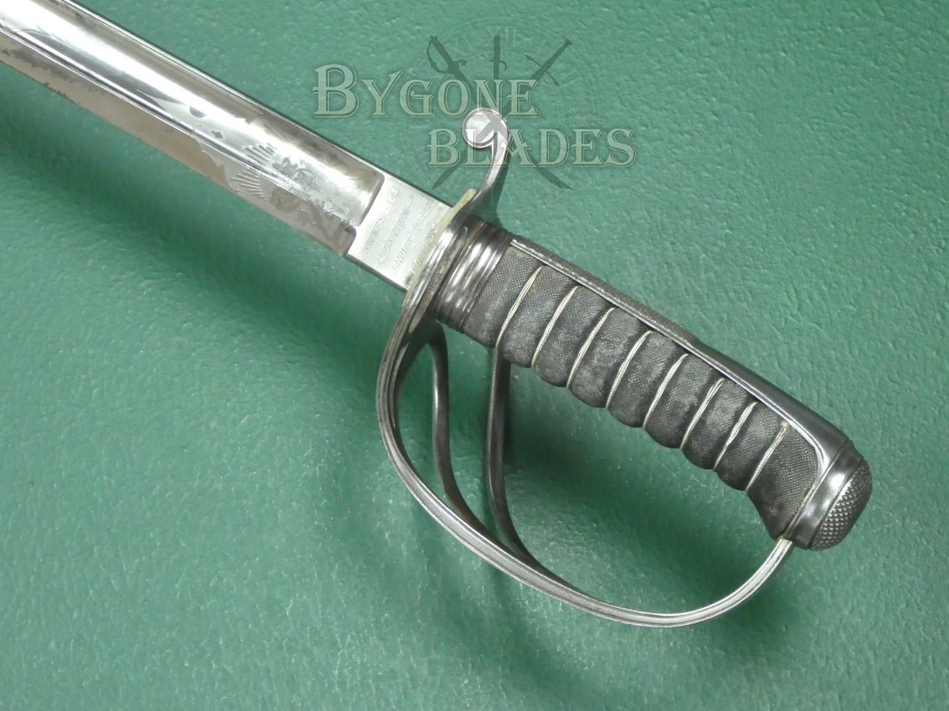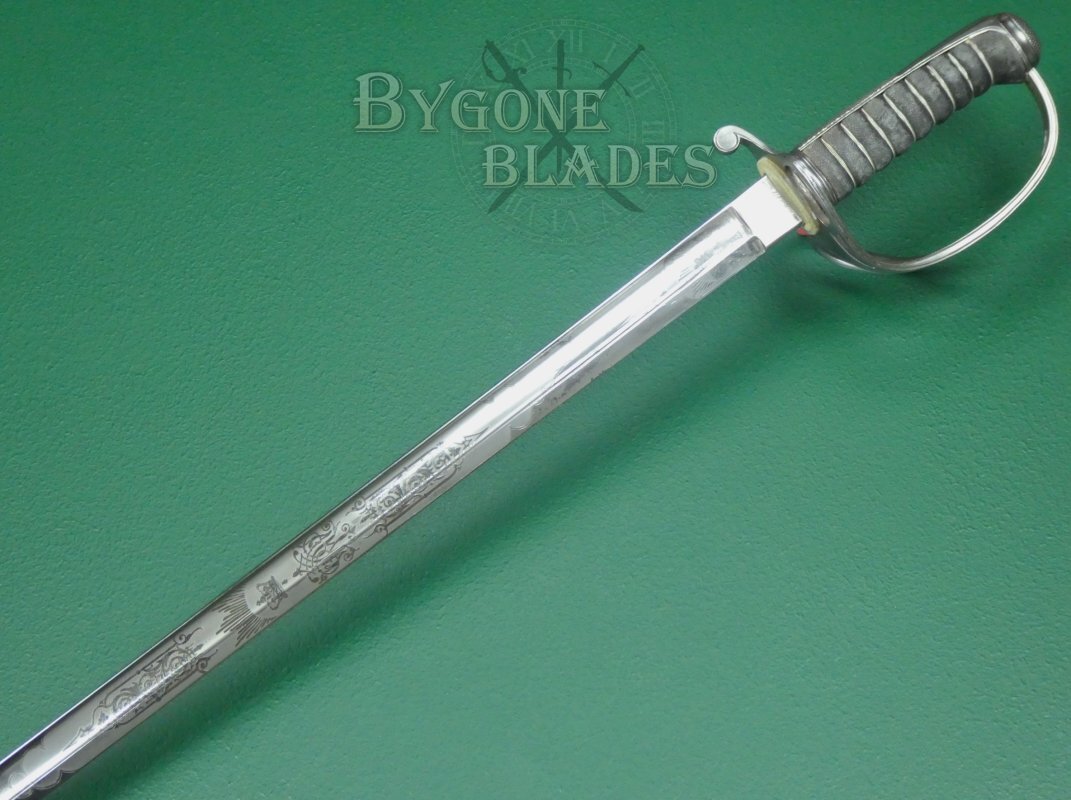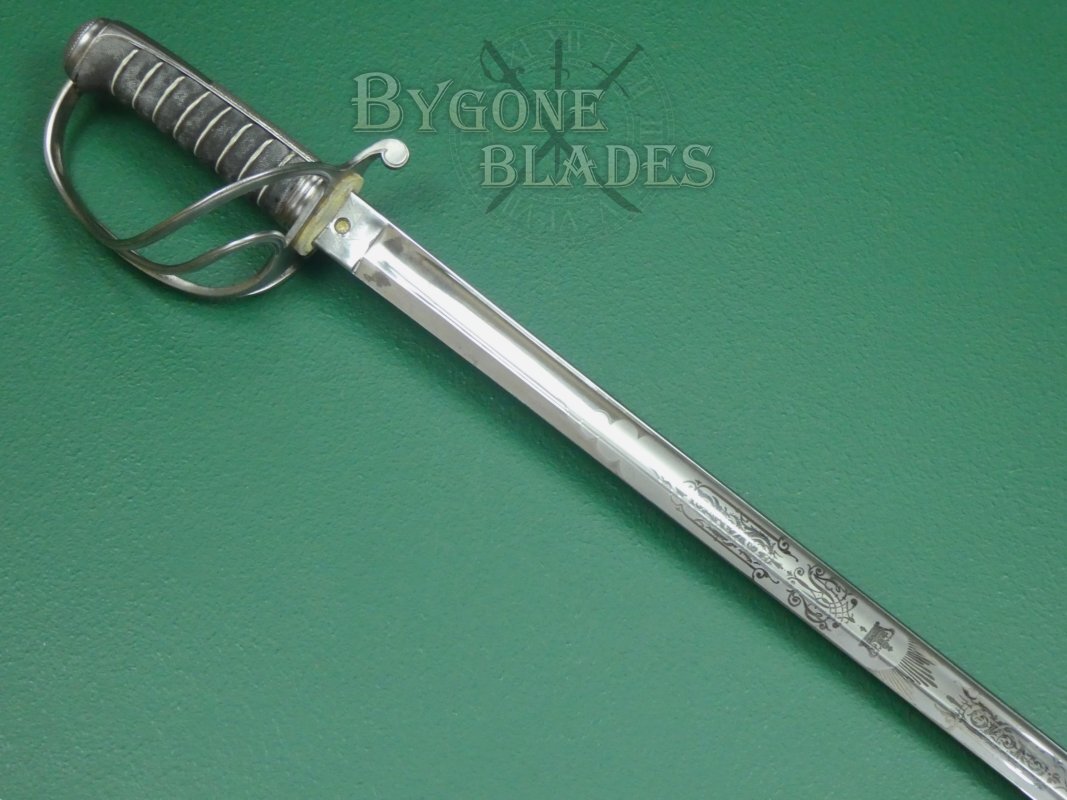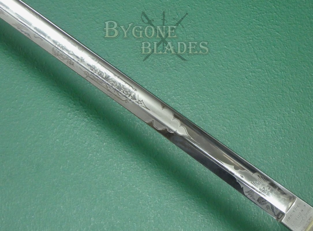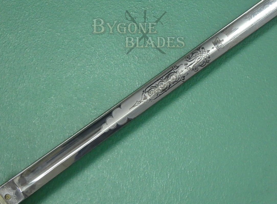 The blade is etched with foliate scrollwork panels above and below the crowned Royal cypher of Queen Victoria. The obverse is similarly etched and includes the Royal coat of arms on the forte.